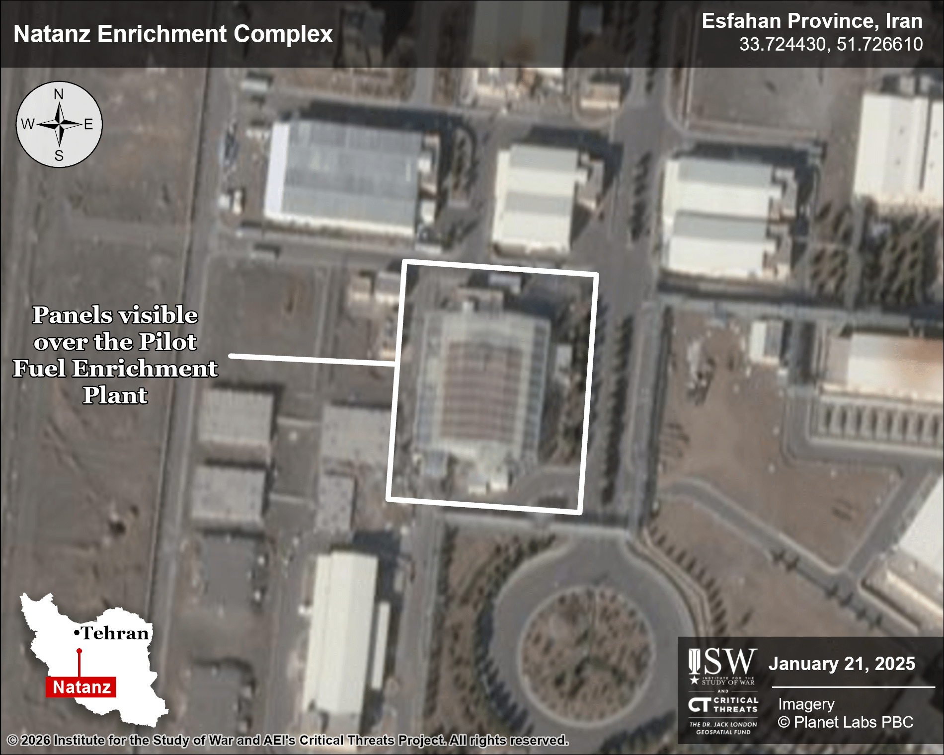 - Repairs at Natanz Nuclear Complex: Iran has covered the anti-drone cage at the Pilot Fuel Enrichment Plant at the Natanz Nuclear Complex with panels, which the Institute for Science and International Security previously assessed are meant to allow Iran to explore the rubble at the site discreetly. It is unclear if Iran has repaired the anti-drone cage under the panels.