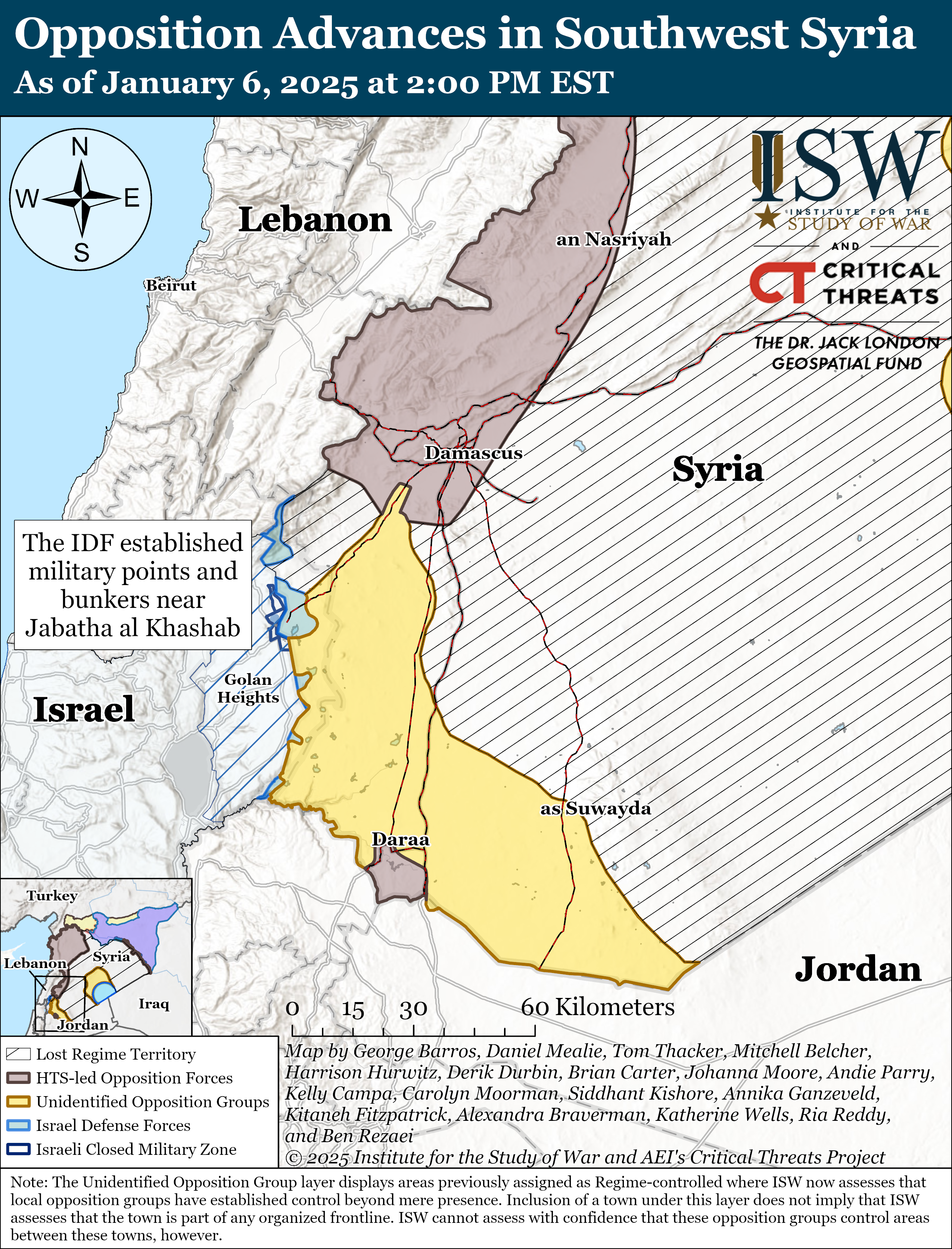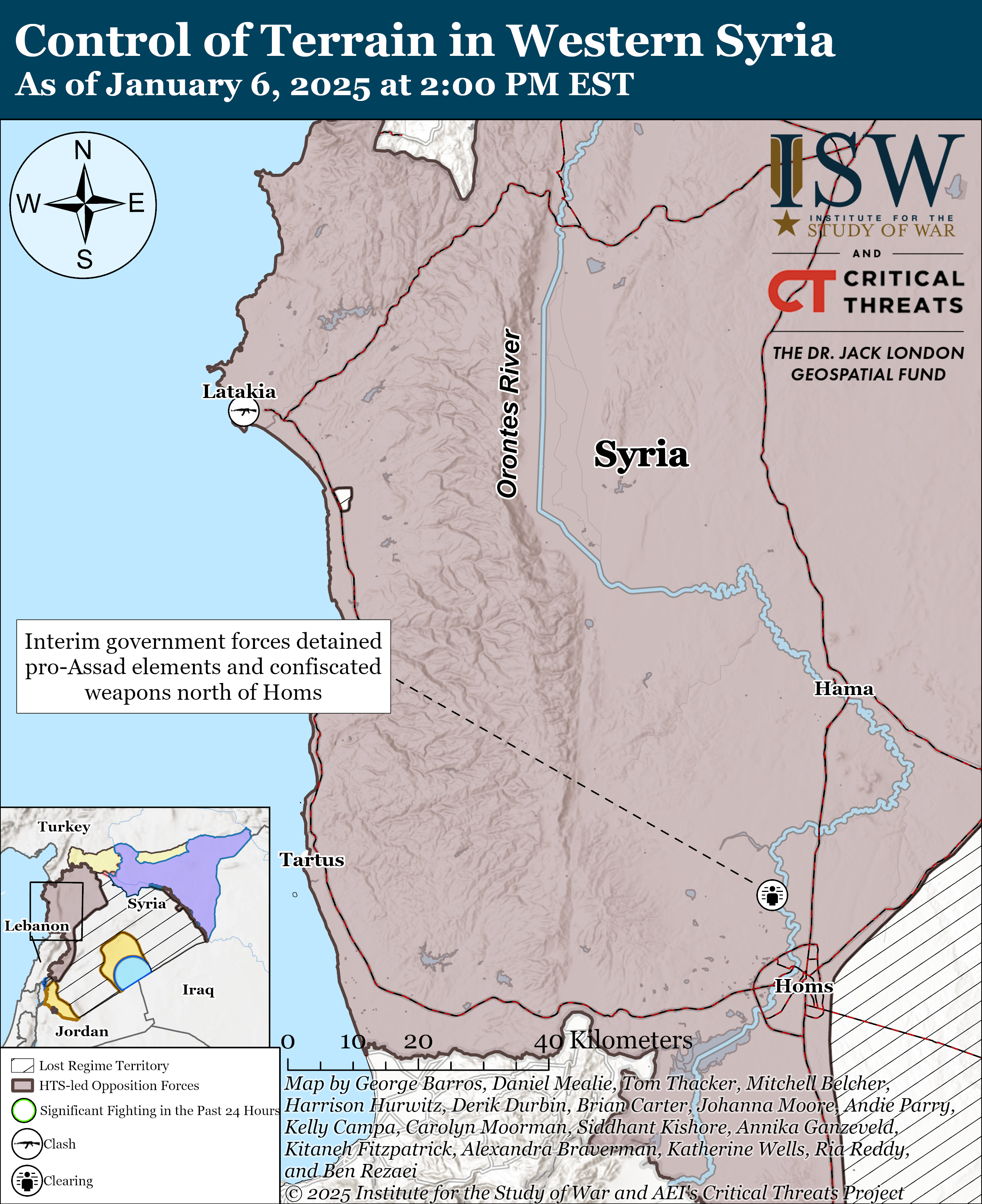 Local Syrian media posted the footage to X (Twitter) on January 6 purportedly showed Syrians in al Sanamayn City, northern Daraa Province, calling for the HTS-led government to hold a local group led by Mohsen al Haymad “accountable for committing violations against them” during a protest.[xxx] A reportedly former regime-affiliated militia led by Mohsen al Haymad clashed with other unspecified local factions in al Sanamayn City between January 2 and 4.[xxxi] Haymad’s group and the other unspecified local factions agreed to a ceasefire and to hand over heavy weapons to HTS forces, following the HTS-led Department of Military Operations deployment to the area on January 5.[xxxii] HTS-controlled forces will remain in al Sanamayn to set up checkpoints and maintain security within the city following this agreed-upon ceasefire.[xxxiii]