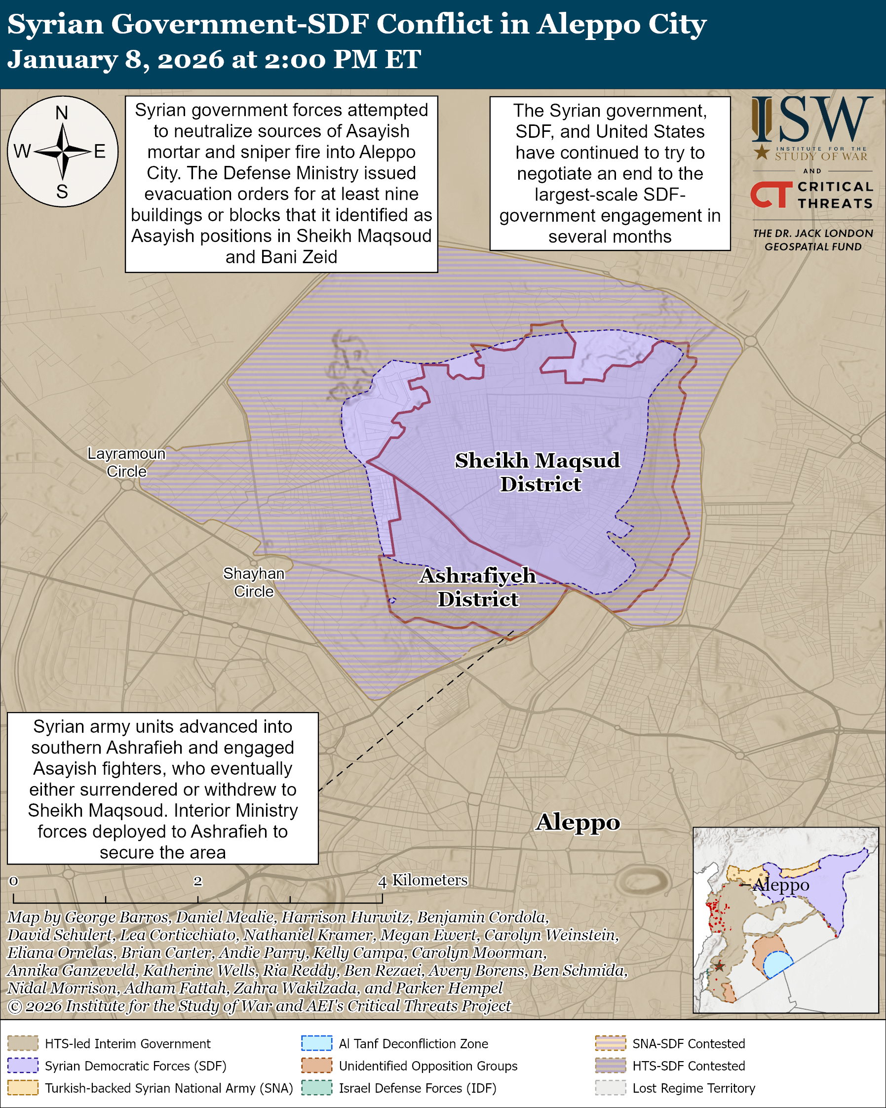 - Syrian Government-SDF Fighting in Aleppo City: The Syrian government secured areas of Kurdish neighborhoods in Aleppo City on January 8 as fighting between the Syrian army and Syrian Democratic Forces (SDF)-affiliated fighters continued for a third day. The recent fighting in Aleppo indicates that the previous SDF-government agreement has been largely insufficient in its current form to integrate Kurdish forces into the Syrian state and prevent new rounds of conflict.