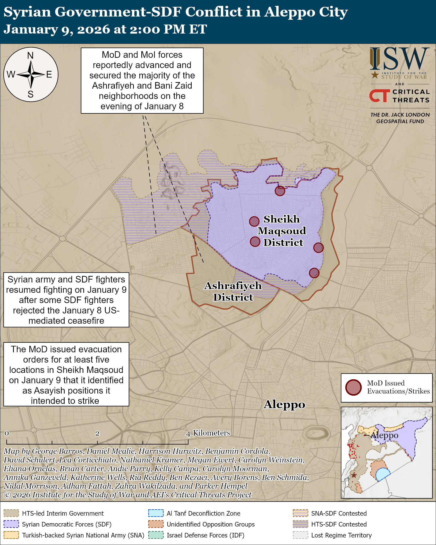 - Syrian Government-SDF Fighting in Aleppo City: Syrian army and Syrian Democratic Forces (SDF)-affiliated fighters resumed fighting in Kurdish neighborhoods of Aleppo City on January 9 after some SDF-affiliated fighters and a local Kurdish council rejected the January 8 US-mediated ceasefire.