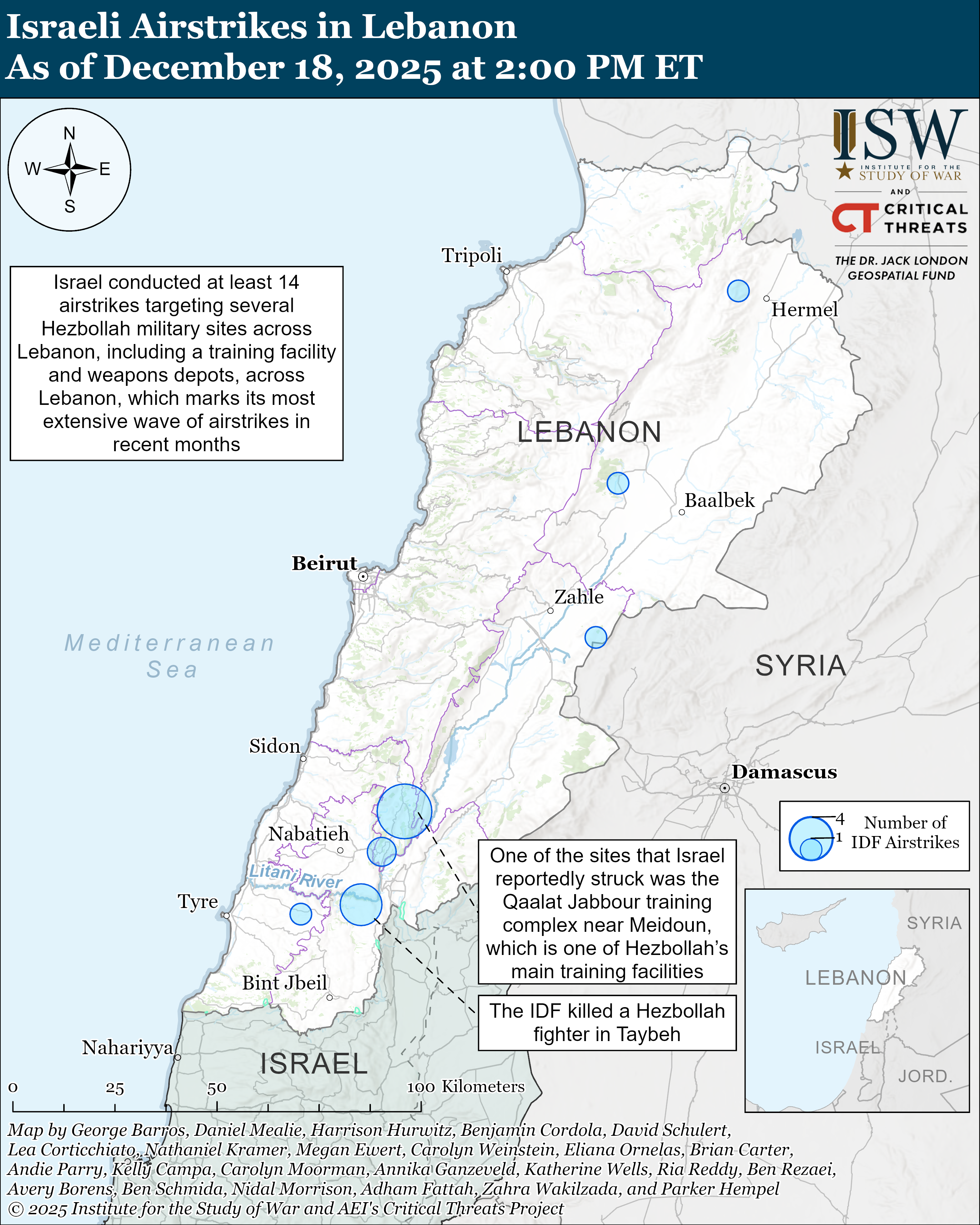 Israel’s January 9 airstrikes may indicate that the Lebanese Armed Forces (LAF) has had moderate success in disarming Hezbollah south of the Litani River. The Israel Defense Forces (IDF) conducted at least 32 airstrikes targeting Hezbollah weapons production sites, weapons depots, artillery launch sites and launchers, and other military sites across Lebanon on January 9.[xxxvi] These strikes mark the third wave of Israeli strikes in recent weeks, following strikes on at least 14 Hezbollah targets on December 18 and 17 targets on January 2.[xxxvii] Israel’s January 2 and 9 strikes focused on Hezbollah targets north of the Litani River, in contrast to the December 18 strikes that primarily focused on targets along the Litani River. Israel’s January 9 strikes notably came a day after the LAF announced that it had mostly disarmed Hezbollah south of the Litani River and will begin preparations for the next disarmament phase.[xxxviii] The recent shift in the location of large waves of Israeli airstrikes from south of the Litani to north of the Litani suggests that Israel perceives a reduced threat south of the Litani. Israel’s January 2 and 9 airstrikes targeted areas between the Litani and Awali rivers, which is where the LAF’s next disarmament phase is expected to take place.[xxxix] The shift in the IDF’s targeting pattern suggests that the LAF’s success in disarming Hezbollah and reducing the threat the group poses to Israel influences Israel’s military activities in Lebanon. The IDF occasionally conducts one-off airstrikes targeting Hezbollah reconstitution activities in southern Lebanon when it identifies threats.[xl]