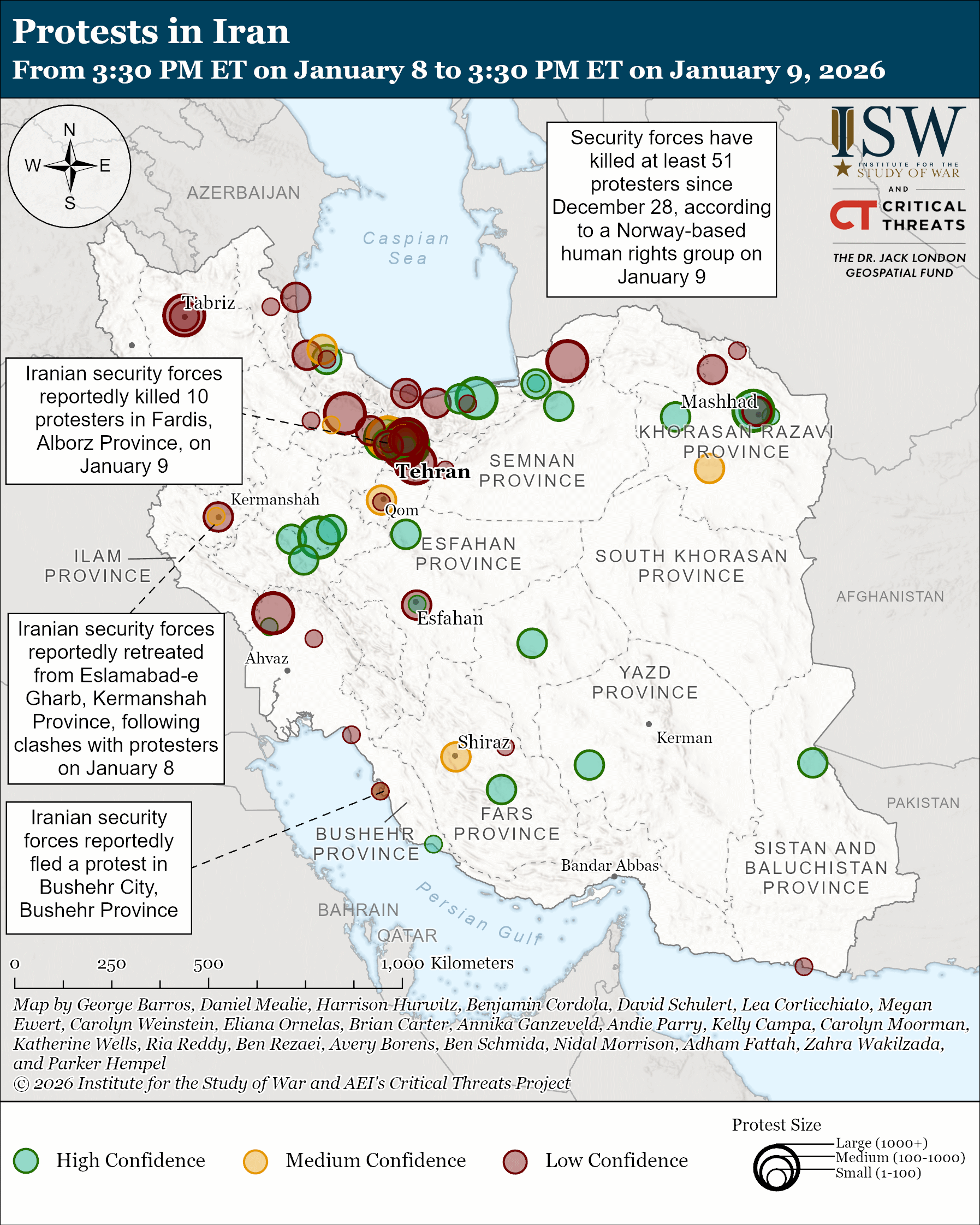 The Iranian regime has sustained its nationwide internet shutdown, likely to disrupt protest coordination and obscure the scale of its crackdown.[i] Reports indicate that Iran’s internet connectivity has remained at approximately one percent of normal levels since 3:00 PM ET on January 8.[ii] The Iranian regime has historically imposed internet blackouts during periods of major unrest, including during the 2019 protests, when the regime killed around 1,500 protesters in less than two weeks.[iii] The internet shutdown reflects the regime’s concerns about the momentum of the protests and international scrutiny on its repression. The regime likely shut down the internet to disrupt protesters’ ability to communicate with one another and organize protests. The regime has also expanded its use of lethal force to crack down on protests beyond western and central Iran, and the internet shutdown is likely meant to hide the extent and brutality of the regime’s crackdown across Iran.[iv] A Norway-based Iranian human rights organization reported on January 9 that Iranian security forces have killed at least 51 protesters, including nine minors, and wounded hundreds of others since December 28.[v] Anti-regime media reported on January 9 that Iranian security forces killed at least 10 protesters during demonstrations in Fardis, Alborz Province.[vi]