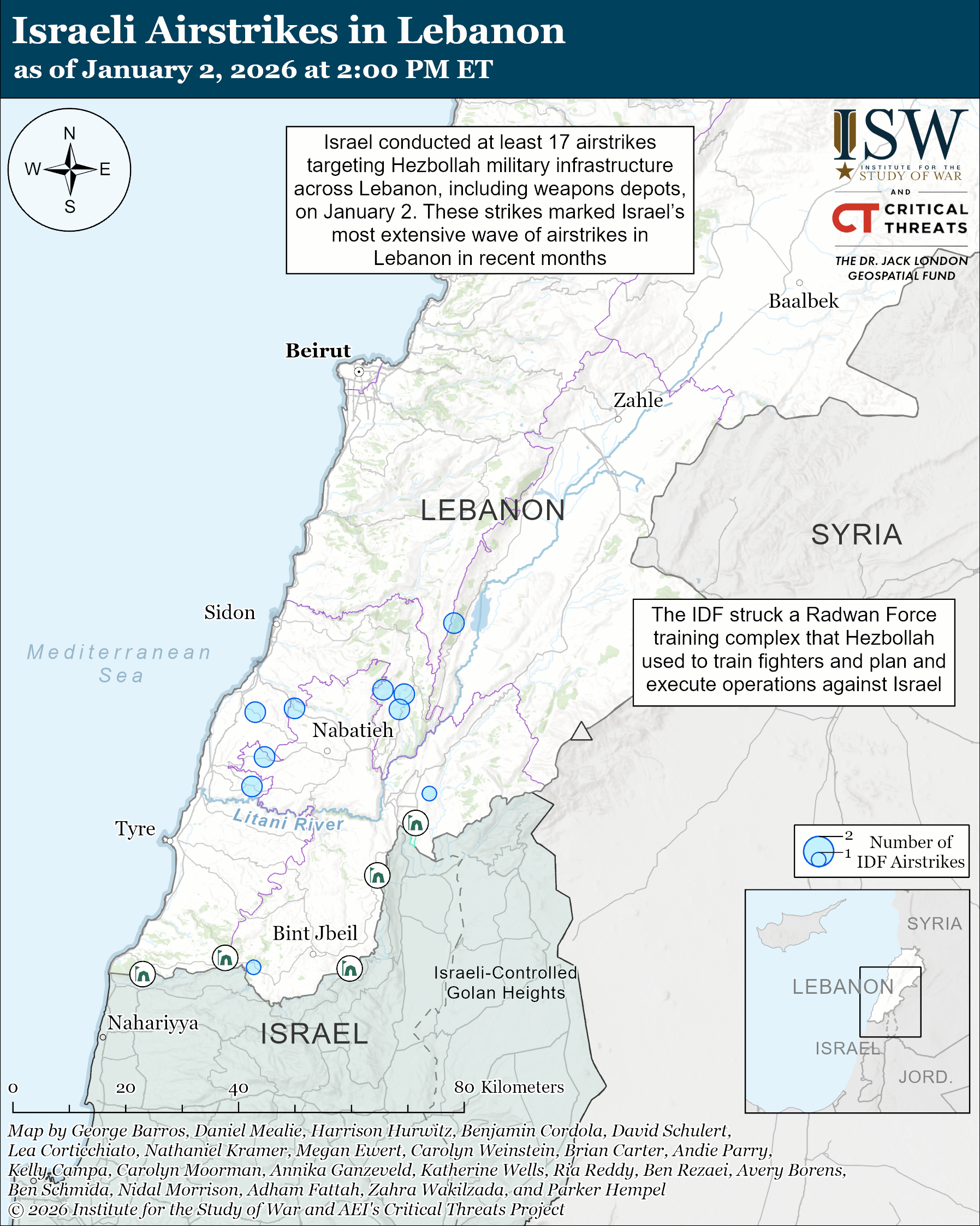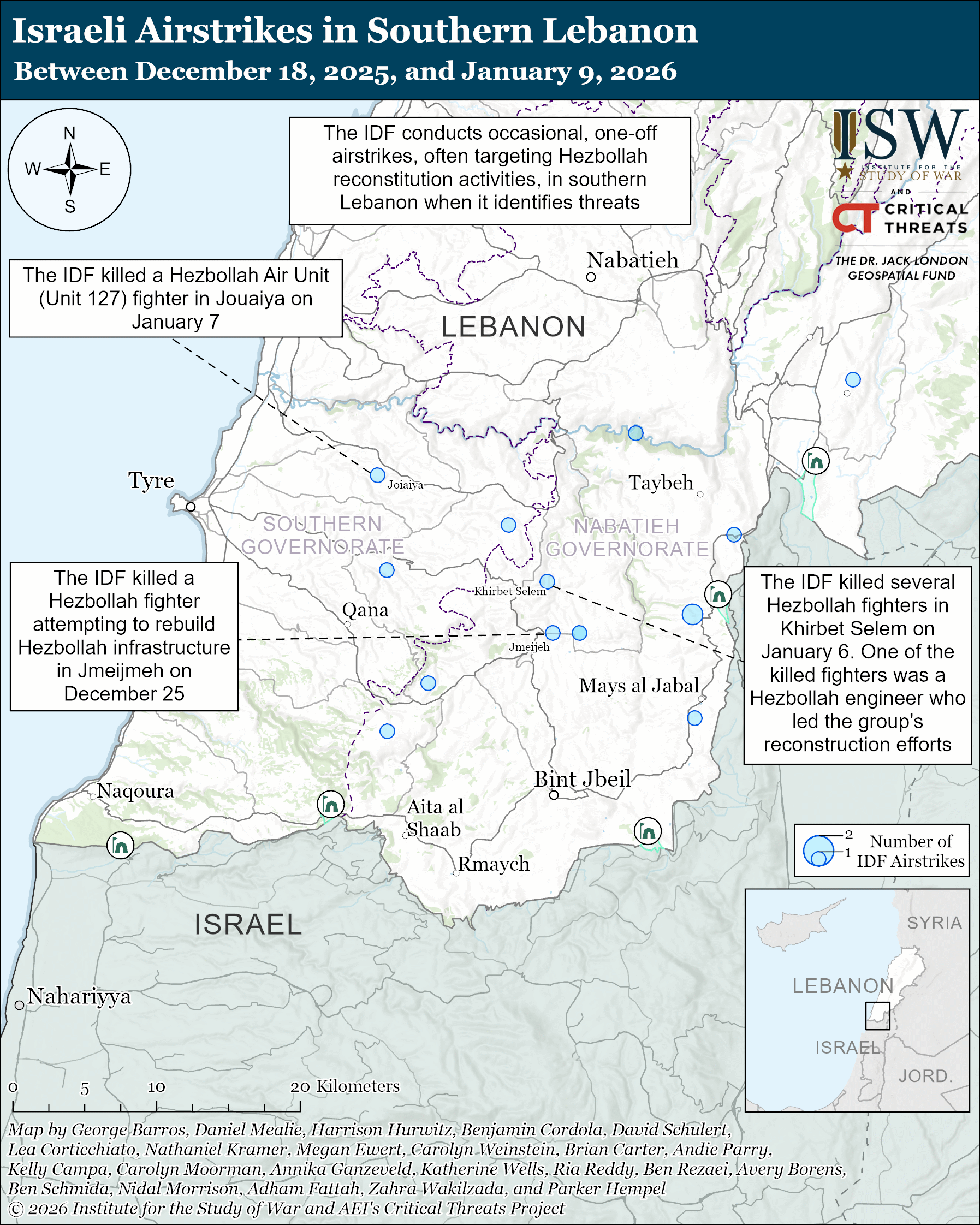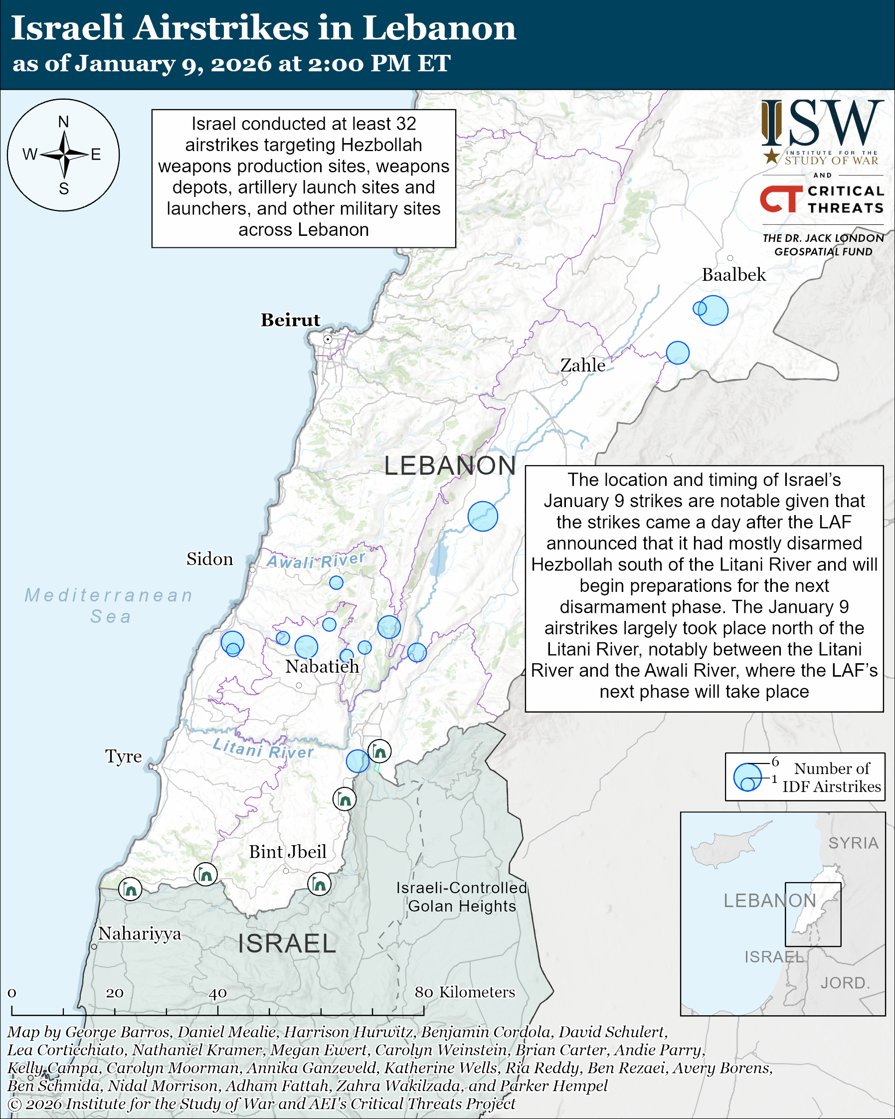 - Israeli Airstrikes in Lebanon: Israel’s January 9 airstrikes may indicate that the Lebanese Armed Forces (LAF) has had moderate success in disarming Hezbollah south of the Litani River. The pattern of Israel’s major strike waves suggests that Israel conducts airstrikes only where it perceives a threat and refrains from large-scale strikes in locations where it deems the LAF has effectively reduced Hezbollah’s threat to Israel.