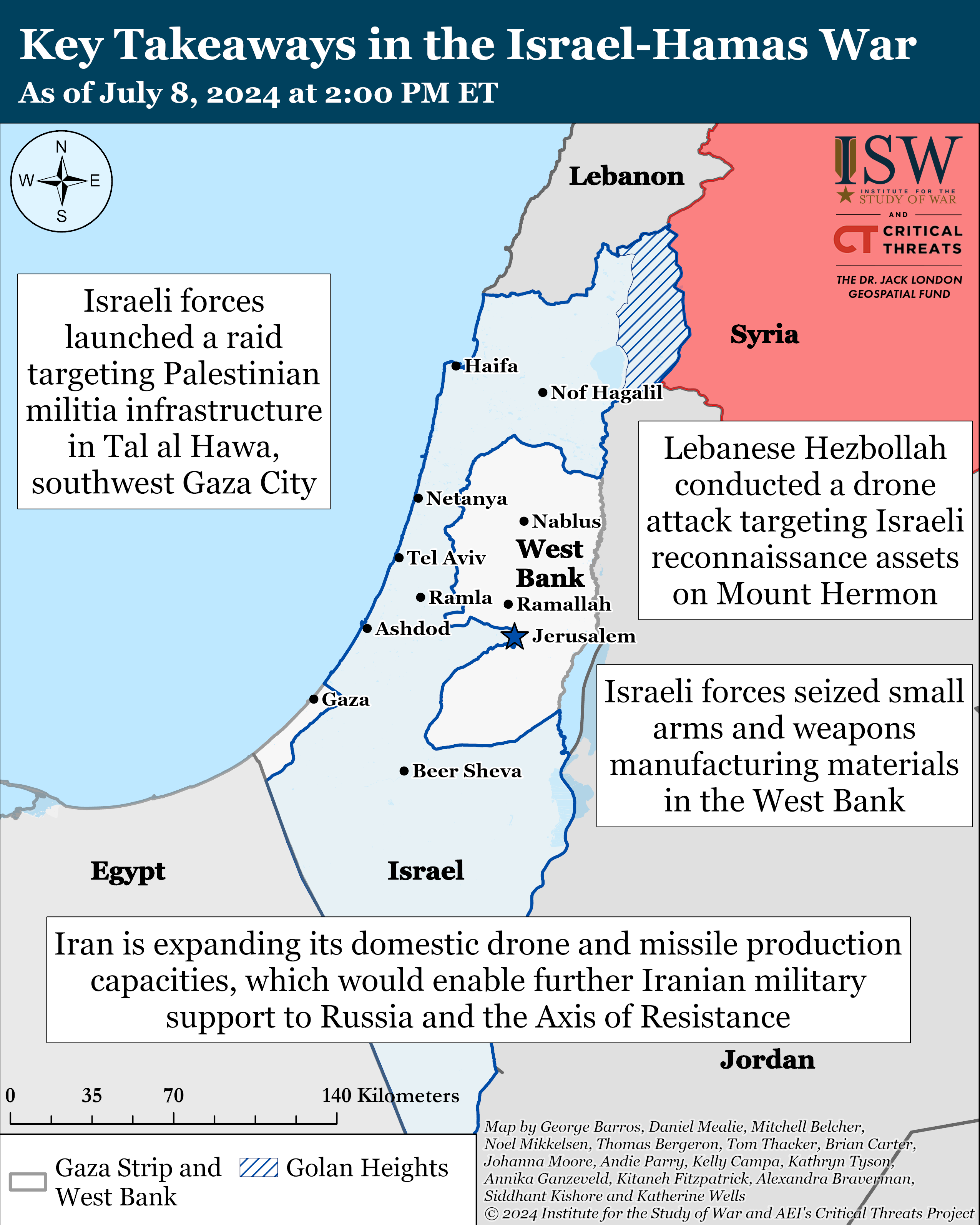 Lebanese Hezbollah conducted at least five attacks into northern Israel since CTP-ISW's last data cut-off on July 7.[lxv] Hezbollah launched a drone attack targeting long-range Israeli reconnaissance equipment on Mount Hermon in response to an Israeli strike that killed a Hezbollah air defense engineer on July 7.[lxvi] The IDF said that a one-way attack drone fell in an open area near Mount Hermon.[lxvii] Hezbollah has previously targeted other IDF surveillance equipment and air defense assets in response to Israeli strikes into Lebanon.[lxviii]