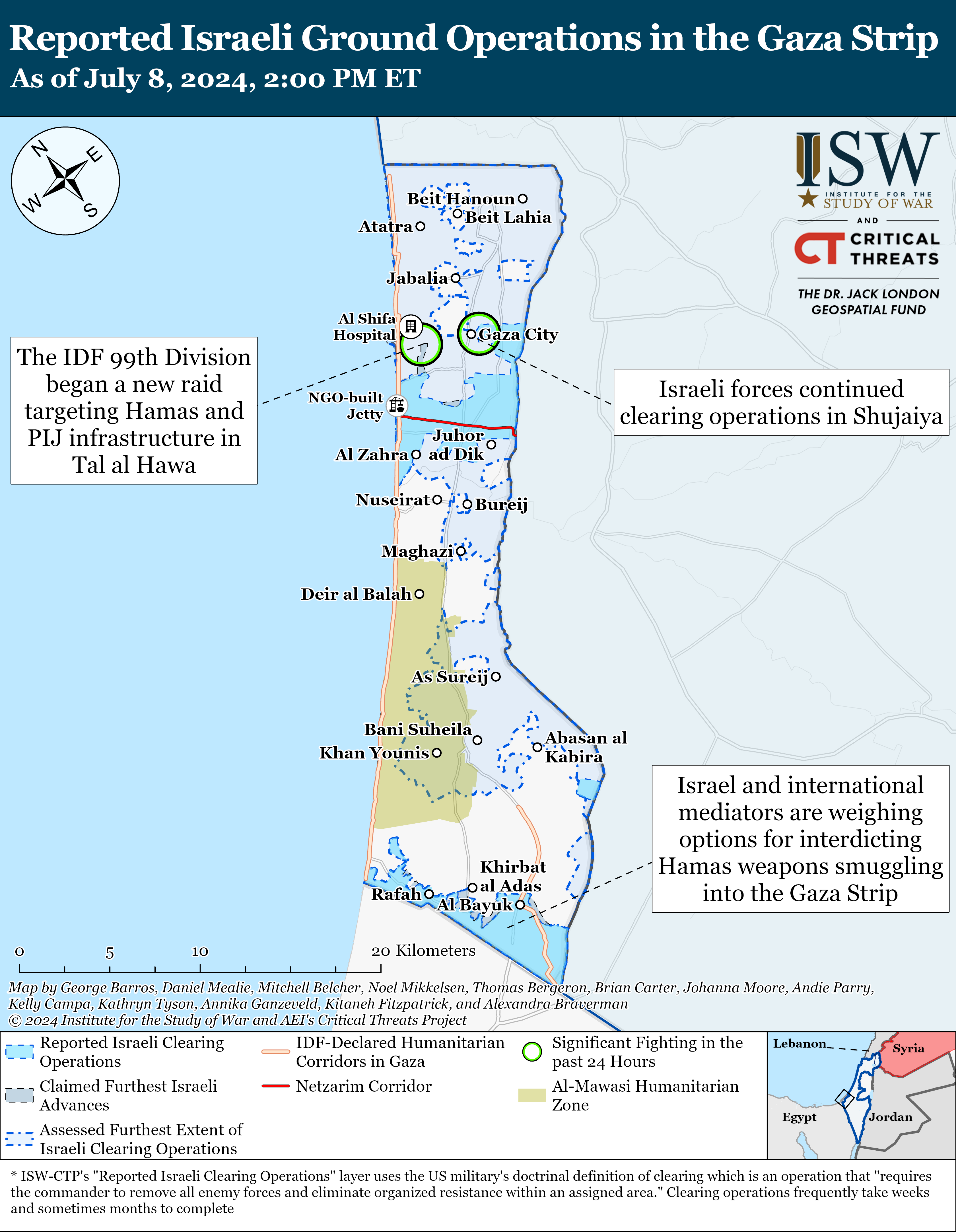 The IDF issued evacuation orders for Sabra, Rimal, Tal al Hawa, and Daraj neighborhoods of Gaza City on July 8.[xxxiii] Israeli forces are actively operating in the evacuation area.[xxxiv] The IDF Arabic-language spokesperson ordered residents to evacuate to Deir al Balah in the central Gaza Strip.[xxxv] Evacuees must cross through the IDF-controlled Netzarim Corridor to get to Deir al Balah. The IDF uses the Netzarim Corridor to prevent Palestinian fighters from moving freely across the Gaza Strip as well as for launching raids.