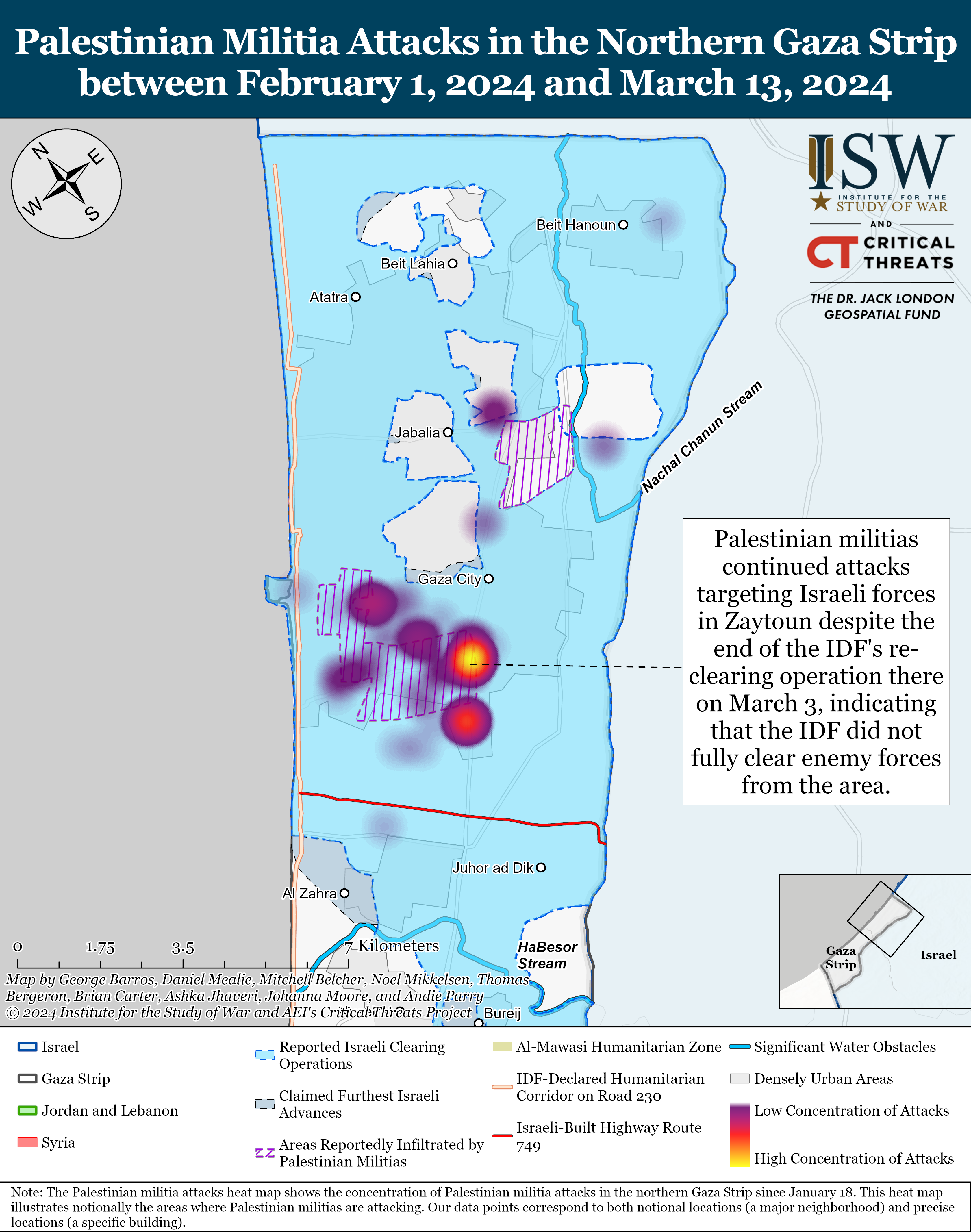 Israeli media reported on March 13 that the Israel Defense Forces (IDF) Navy fired at two suspected Palestinian fighters in scuba gear approaching the border between the northern Gaza Strip and Israel.[i] CTP-ISW has not recorded Palestinian fighters attempting to infiltrate into Israel from the Gaza Strip since early November 2023.[ii] An IDF Navy helicopter destroyed an unspecified Palestinian vessel near Gaza City on March 11.[iii]