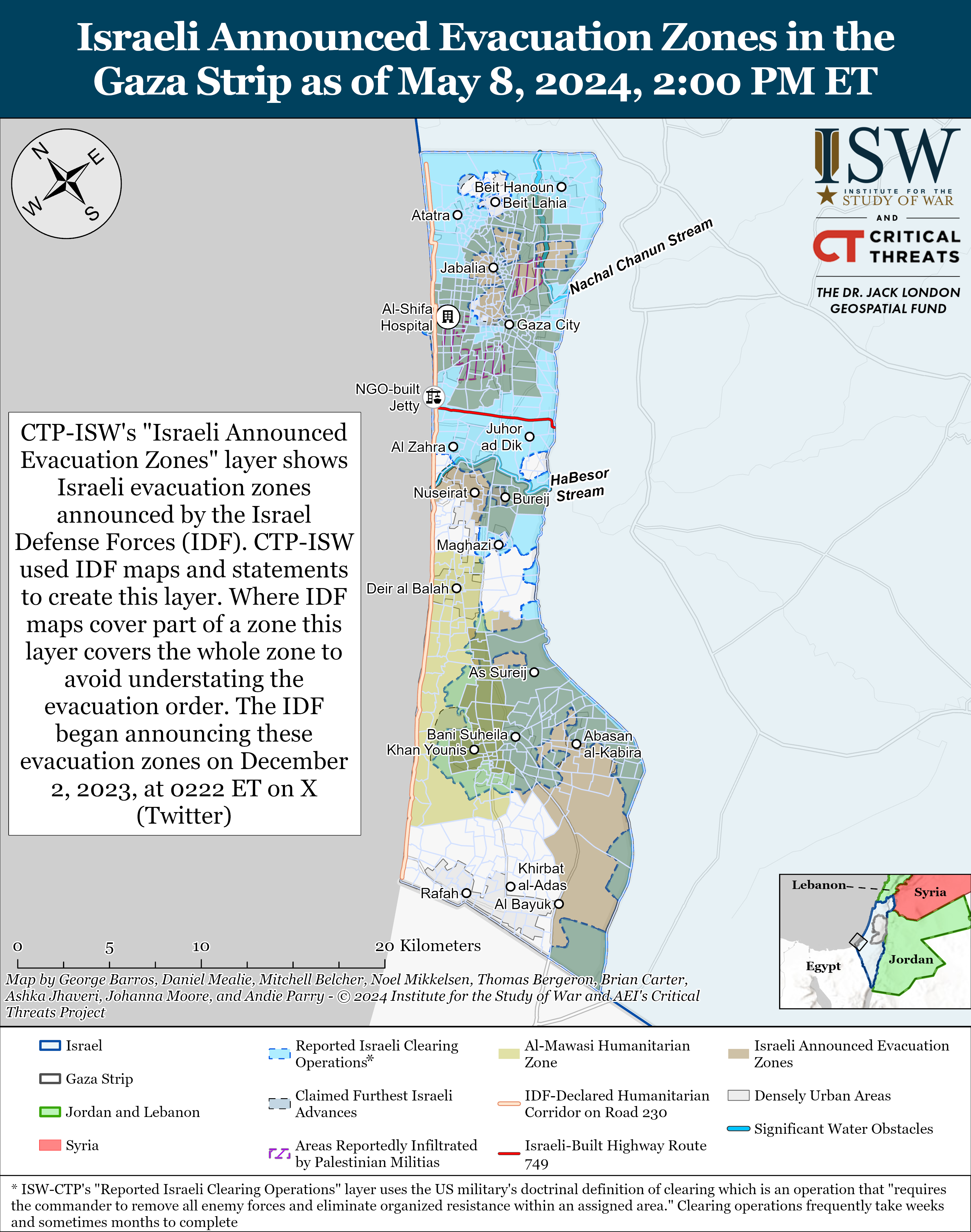 The IDF reopened the Kerem Shalom crossing on May 8 to allow humanitarian aid into the Gaza Strip.[xlii] The IDF closed the Kerem Shalom crossing on May 5 after a Hamas rocket attack that killed four IDF soldiers near the crossing.[xliii] The Coordination of Government Activities in the Territories (COGAT), which is the Israeli military body responsible for facilitating the flow of aid into the Gaza Strip, said on May 8 that aid trucks had arrived at Kerem Shalom for inspection.[xliv] The United Nations Relief and Works Agency for Palestine Refugees in the Near East (UNRWA) said on May 8 that no aid has entered the Gaza Strip from the crossing on May 8. UNRWA added that there are no workers to receive the aid due to Israel’s incursion into the area.[xlv] Egyptian officials told the Wall Street Journal that Egypt blocked all aid trucks in Egypt from entering the Strip by way of the Kerem Shalom crossing after Israel announced that it was reopening the crossing.[xlvi] Egypt’s move cuts off the ability for aid trucks originating in Egypt to enter the Gaza Strip.