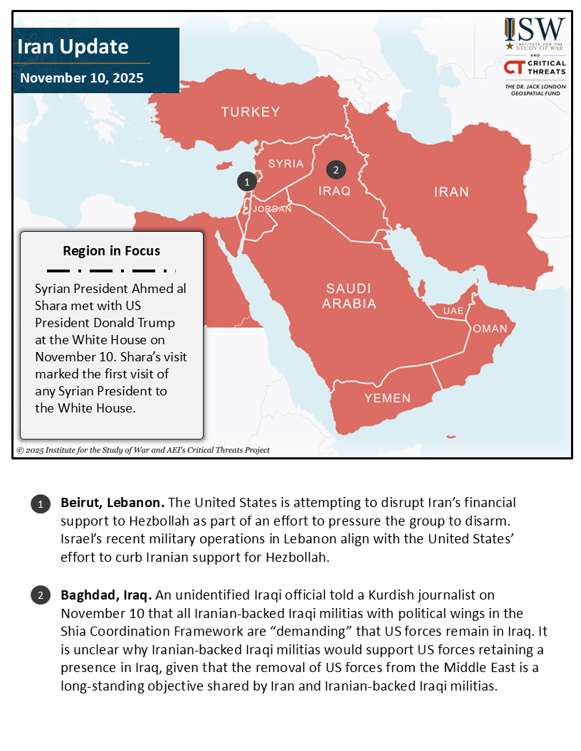 Note: CTP-ISW will publish an abbreviated Iran Update on November 11, 2025, due to the Veterans Day holiday. We will resume our normal coverage on November 12, 2025.