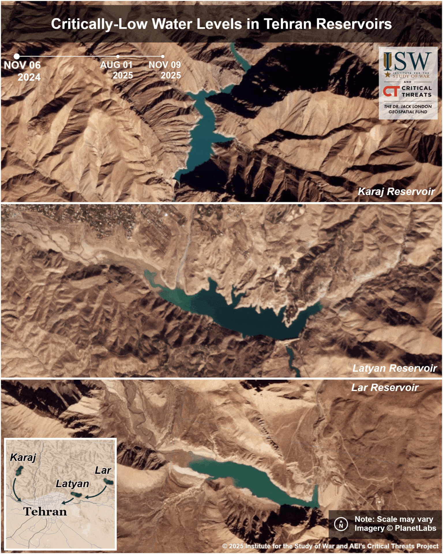Iran is facing water and gas shortages that could lead to internal instability. The Tehran area is facing an unprecedented water shortage crisis due to prolonged drought, overconsumption, and government mismanagement.[lxvi] The Iranian Energy Ministry-owned Water Research Institute stated on November 7 that Tehran must prepare for a crisis after the city received no rainfall in both October and November, despite normally receiving 50–60 millimeters during these months.[lxvii] This drought has caused Tehran’s reservoir volume to drop to about 250 million cubic meters, compared to around 490 million cubic meters in the last Persian calendar year.[lxviii] Iranian President Masoud Pezeshkian warned on November 7 that Tehran may ration water in December if rain does not fall and that individuals may have to evacuate Tehran if the water shortage persists.[lxix] Iranian Energy Minister Abbas Aliabadi announced on November 9 that water suppliers may cut water in some areas of Tehran if the water shortage continues and advised Iranians to install home water storage systems in preparation.[lxx] An Iranian water industry official stated on November 9 that water pressure would be lowered during the night to allow cities to refill their reservoirs.[lxxi] The water shortage crisis demonstrates the Iranian regime’s inability to address the needs of its citizens and could potentially trigger unrest.