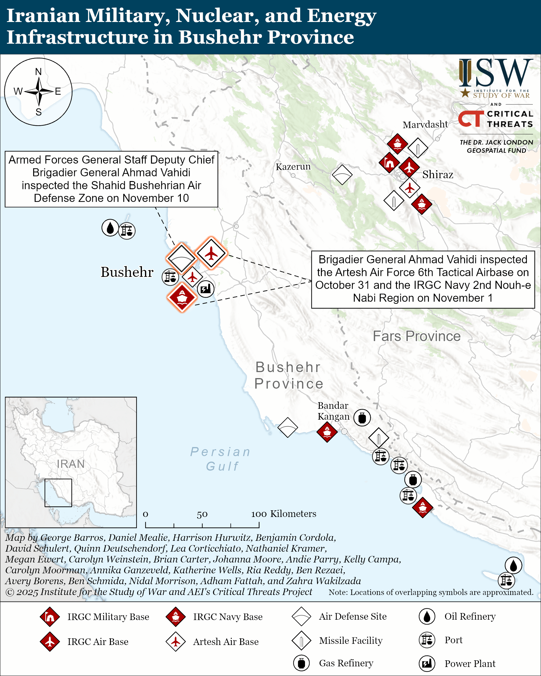 Iranian Armed Forces General Staff Deputy Chief Brigadier General Ahmad Vahidi inspected air defense sites at the Shahid Bushehrian Air Defense Zone in Bushehr Province on November 10.l[lxxvii] Vahidi recently replaced Brigadier General Mohammad Reza Ashtiani as the Armed Forces General Staff Deputy Chief.[lxxviii] Vahidi inspected the Artesh Air Force 6th Tactical Airbase in Bushehr Province on October 31 and the IRGC Navy 2nd Nouh-e Nabi Region in Bushehr Province on November 1.[lxxix] The following map shows important military, nuclear, and energy sites in Bushehr Province, including the three sites that Vahidi recently inspected.