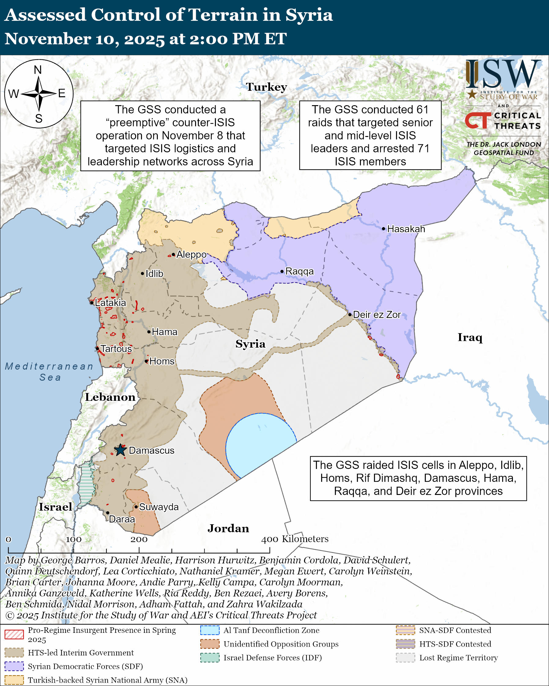 Syria signed a declaration to join the Global Coalition Against the Islamic State in Iraq and al Sham (ISIS) on November 10, two days after government forces conducted a major country-wide operation targeting ISIS leaders and cells.[xv] Syrian Information Minister Hamza al Mustafa stated on November 10 that Syria signed a declaration of “political cooperation” with the counter-ISIS coalition that does not yet include “military components.”[xvi] An unspecified US official told the Wall Street Journal that the “exact terms” of Syria’s role in the coalition are still up for discussion.[xvii] The Syrian transitional government has identified the resurgence of ISIS as one of the most pressing issues facing Syria since the fall of the Assad regime and has conducted counter-ISIS operations in recent months.[xviii] The United States and Syria have conducted at least three joint counter-ISIS operations and have shared intelligence related to ISIS since July 2025.[xix]