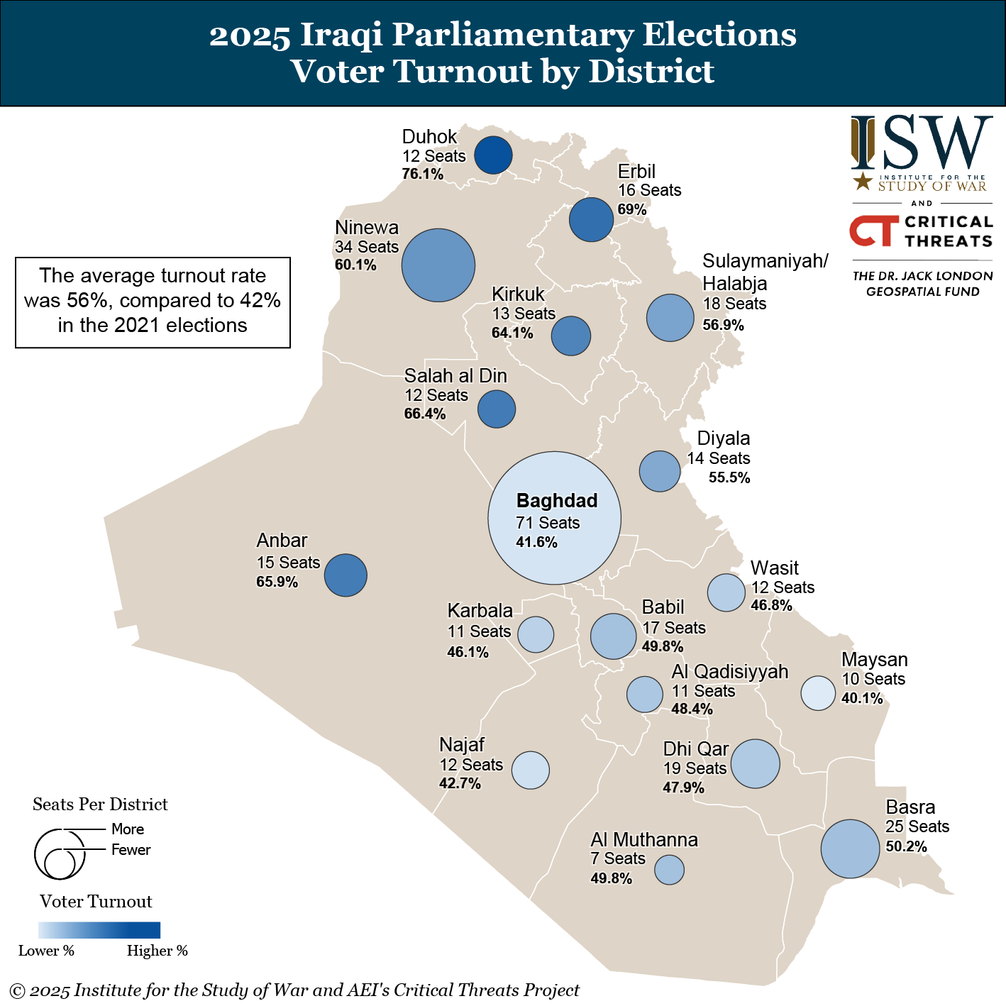 The voter turnout rate was 56 percent in the November 11 Iraqi parliamentary elections, according to Iraq’s electoral commission.[i] Iraq’s electoral commission, the Independent High Electoral Commission (IHEC), previously reported an average voter turnout rate of 24 percent on November 11 before the polls closed.[ii] This high turnout rate comes after various Iraqi political figures expressed concern about low voter turnout on election day.[iii] The average voter turnout rate in the 2021 Iraqi parliamentary elections was approximately 42 percent.[iv] High voter turnout usually benefits large blocs like Iraqi Prime Minister Mohammad Shia al Sudani’s Reconstruction and Development Coalition because lower turnout favors smaller parties with very committed supporters.[v] Sudani's coalition won a plurality of votes in eight Iraqi provinces, including Baghdad Province, which also suggests that Sudani is popular.[vi] A plurality of votes suggests that Sudani performed well, but does not indicate that he will win a large number of seats by default because Iraq’s election system uses proportional representation.[vii] A September 2025 survey noted that Sudani had a 64 percent approval rating, which is among the highest approval ratings for an Iraqi prime minister since 2003.[viii] IHEC started to release the November 2025 election vote counts on November 12, but has not released parliamentary seat allocation results at the time of this writing. CTP-ISW will provide additional analysis about the official election results in future Iran Updates.