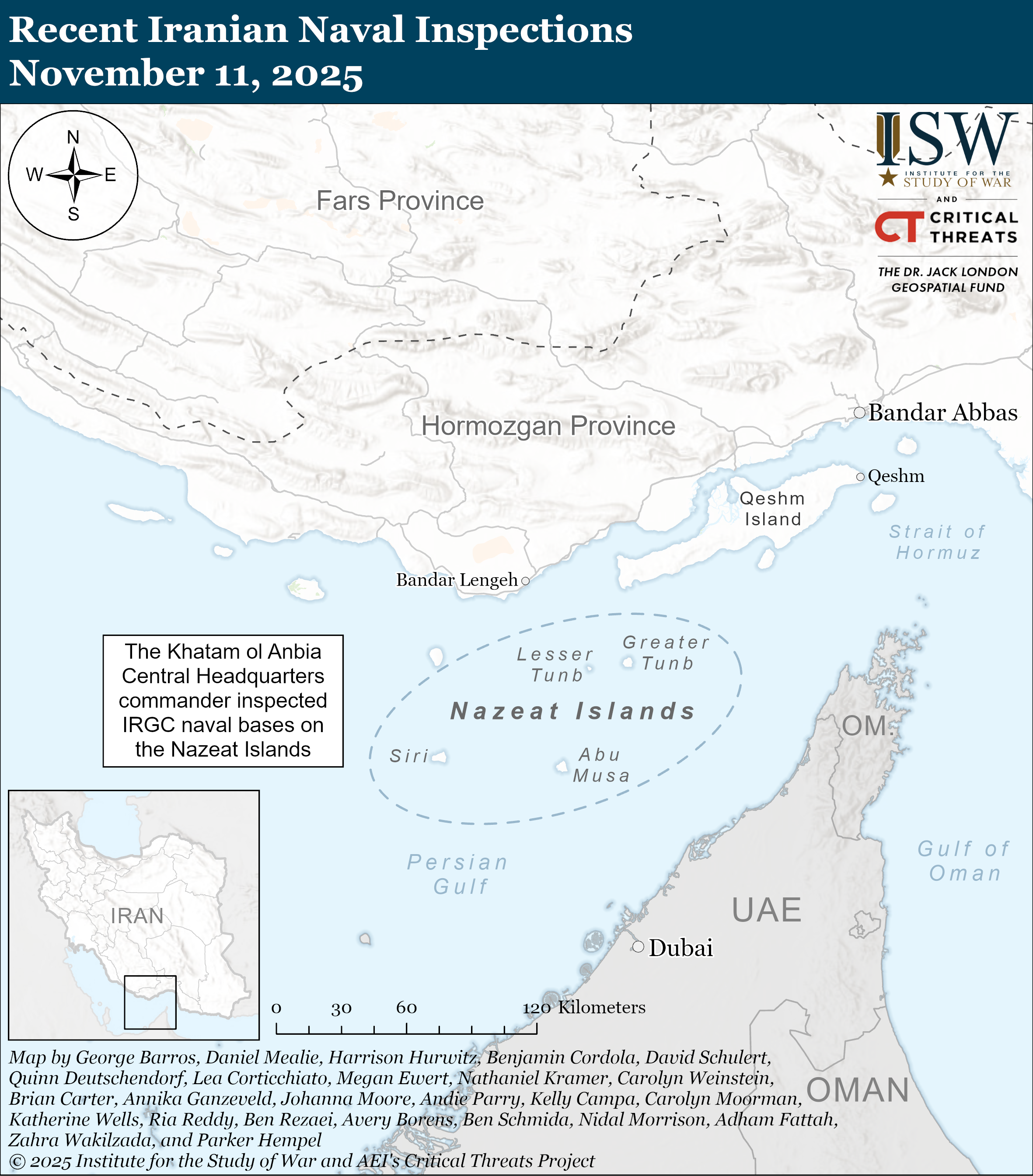 Iranian officials continue to inspect naval units in the Persian Gulf to secure Iran's control over the Gulf, likely as part of Iran’s effort to prepare for any potential conflict with the United States or Israel. These inspections suggest that Iranian officials continue to believe renewed war with the United States or Israel is imminent. Khatam ol Anbia Central Headquarters Commander Major General Ali Abdollahi inspected Islamic Revolutionary Guards Corps (IRGC) naval units deployed on the Nazeat Islands on November 11.[xliii] The Nazeat Islands, including Greater Tunb, Lesser Tunb, Abu Musa, and Siri Island, are key positions for Iran’s ability to control maritime access to the Persian Gulf.[xliv] Abdollahi stated that the IRGC Navy has recently increased its capabilities.[xlv] Abdollahi’s inspection comes amid other key Iranian military commanders, including IRGC Commander Major General Mohammad Pakpour, IRGC Navy Commander Brigadier General Alireza Tangsiri, Armed Forces General Staff Chief Major General (AFGS) Abdol Rahim Mousavi, and Artesh Navy Commander Rear Admiral Shahram Irani, inspections of southern Iranian naval units in recent weeks.[xlvi]
