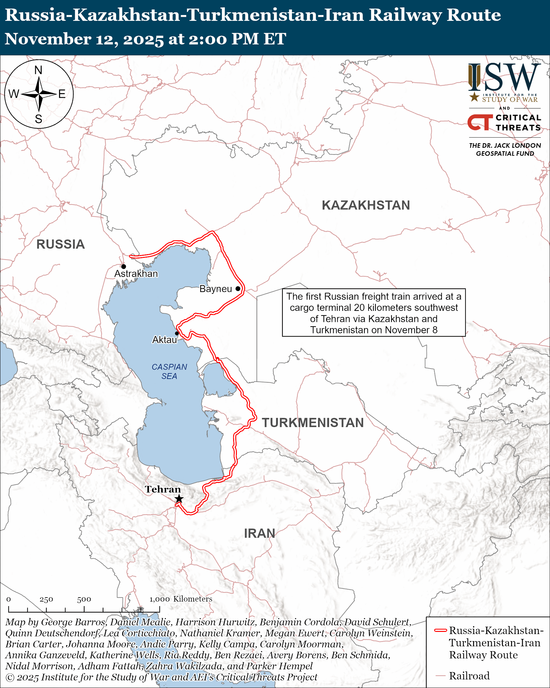 Iran is developing regional trade routes with neighboring countries, likely as part of a broader Iranian effort to mitigate the impact of international sanctions on the Iranian economy. Iran’s Railway Organization’s Deputy Commerce Director stated on November 8 that Iran intends to become a regional trade “hub” after the first Russian freight train arrived at Aprin Dry Cargo Terminal, which is located about 20 kilometers southwest of Tehran City, via Kazakhstan and Turkmenistan.[xxxiv] Iran’s Railway Organization opened Aprin Dry Port in June 2025, and 30 trains from unspecified locations have stopped there so far, according to the organization’s Deputy Commerce Director.[xxxv] The train previously transited a border checkpoint at Incheh Borun economic free zone in northeastern Iran on November 8.[xxxvi] More than 60 companies have reportedly invested in the 4,000-hectare Incheh Borun economic free zone between Iran and Turkmenistan to cut trade and transportation costs, according to Iran’s Golestan Province Governor in October 2025.[xxxvii]