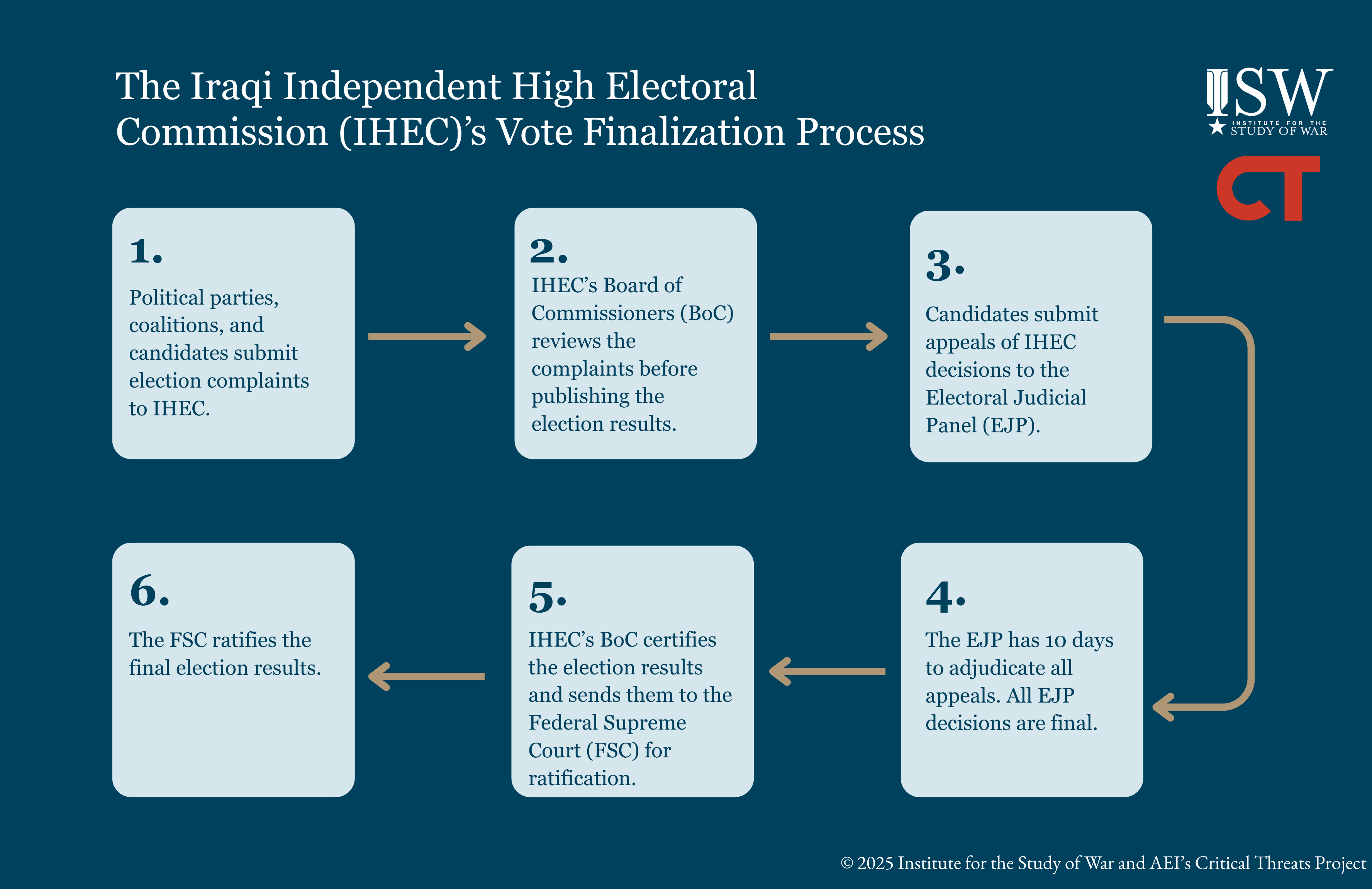These discussions have continued even though the Independent High Electoral Commission (IHEC) has not finalized the election results or released the preliminary election results yet.[xxviii] IHEC must first review all election complaints that political parties, coalitions, and candidates submitted before publishing the parliamentary election results.[xxix] IHEC reported on November 13 that parties, coalitions, and candidates have so far submitted 101 election complaints.[xxx] Political parties, coalitions, and candidates can then appeal both IHEC’s decisions on complaints and the final electoral results to the Electoral Judicial Panel.[xxxi] IHEC will then certify all election results and send them to the Federal Supreme Court for ratification, following any additional adjudication by the Electoral Judicial Panel.[xxxii] The Federal Supreme Court’s ratification of the results is the first step in government formation.[xxxiii] CTP-ISW will provide additional analysis about Iraq’s official election results in future Iran Updates.