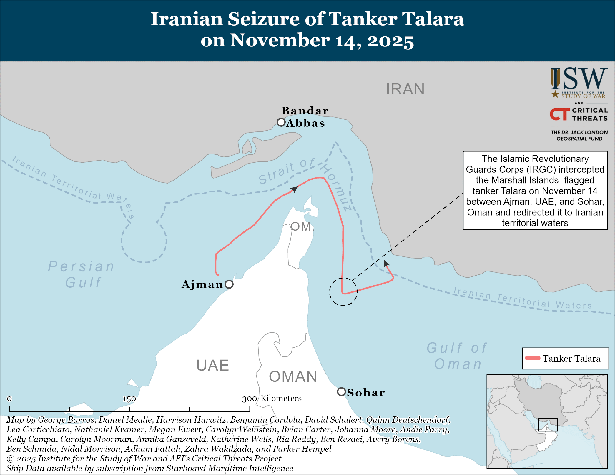 Three small Islamic Revolutionary Guards Corps (IRGC) vessels intercepted a Marshall Islands-flagged oil products tanker, Talara, and moved it into Iranian waters in the Strait of Hormuz on November 14.[i] The vessel is operated by Cyprus-based, German- and British-owned Columbia Ship Management. The vessel is owned by Pasha Finance, which allegedly has familial ties to Azerbaijani President Ilham Aliyev.[ii] The vessel was headed to Singapore from the United Arab Emirates (UAE) and was carrying a cargo of high-sulfur gasoil.[iii] Iranian naval forces intercepted the vessel on early Friday morning and diverted it into Iranian territorial waters.[iv] Columbia Ship Management stated that it lost contact with the vessel around 0822 local time near the coast of Khor Fakkan, United Arab Emirates. The IRGC issued a statement on X on November 14, quoting a Quranic verse: “So whoever has assaulted you, then assault him in the same way that he has assaulted you,” suggesting that Iran is retaliating for a previous incident.[v]