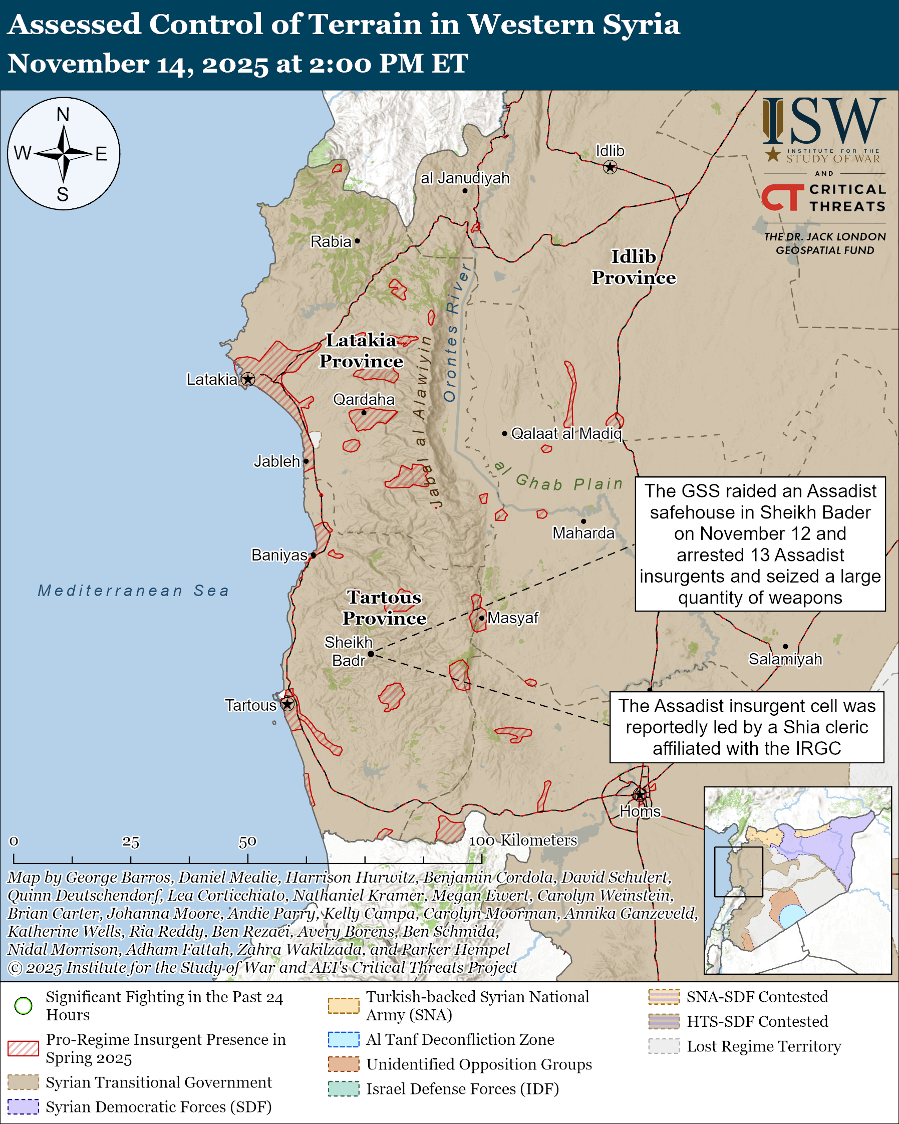 Unknown actors are attempting to develop a covert pro-Assad insurgent and support networks in coastal Syria. The Syrian General Security Service (GSS) dismantled a large, well-equipped Assadist insurgent cell in Sheikh Bader, Tartous Province, on November 12.[xxxiv] GSS forces raided an Assadist safehouse in Sheikh Bader, where they arrested 13 Assadist insurgents and seized a large quantity of weapons and ammunition, including RPGs, marksman rifles, and machine guns.[xxxv] The Assadist safehouse also contained a small field clinic, communication devices, and an additional weapon cache hidden in a nearby cave.[xxxvi] The Ministry of Interior (MoI) said that the Assadist cell was led by a Shia cleric from Idlib Province who had coordinated with Iran and the IRGC to organize pro-Iran religious events in Aleppo City from 2018-2024.[xxxvii] The MoI claimed that the Assadist cell killed 20 civilians in various attacks and attempted to recruit young men and children into the group.[xxxviii] Covert activities are activities that a sponsor or group executes to conceal their identity or involvement, but the activities themselves--in this case, killings--are usually visible. The group did not claim these killings or activities.