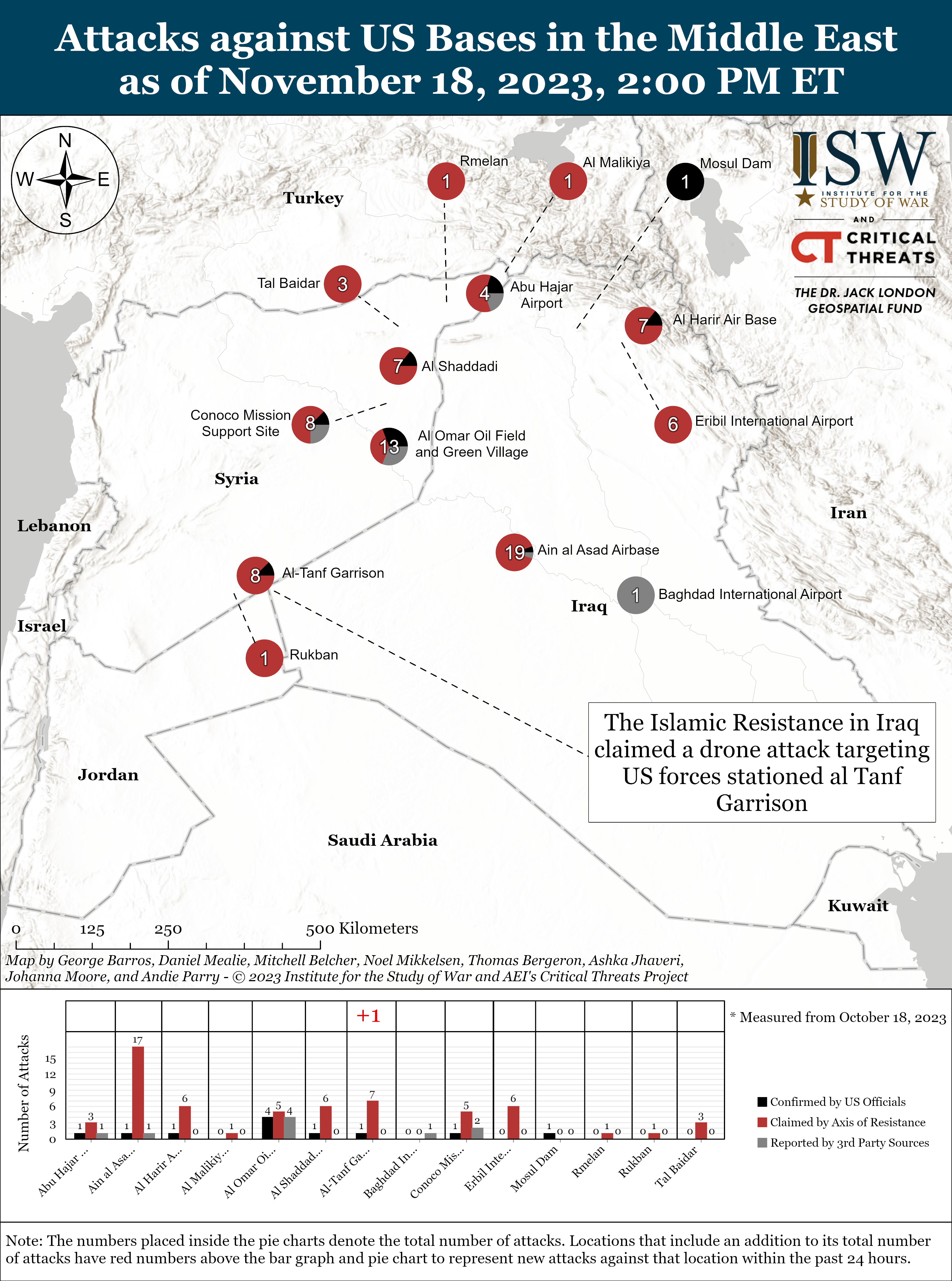 The Islamic Resistance in Iraq—a coalition of Iranian-backed Iraqi militias—claimed on November 18 to conduct a one-way drone attack on US forces at al Tanf garrison in southeastern Syria.[xxxii] This attack marks the eighth Iranian-backed attack on al Tanf garrison that CTP-ISW has recorded since the Israel-Hamas war began.