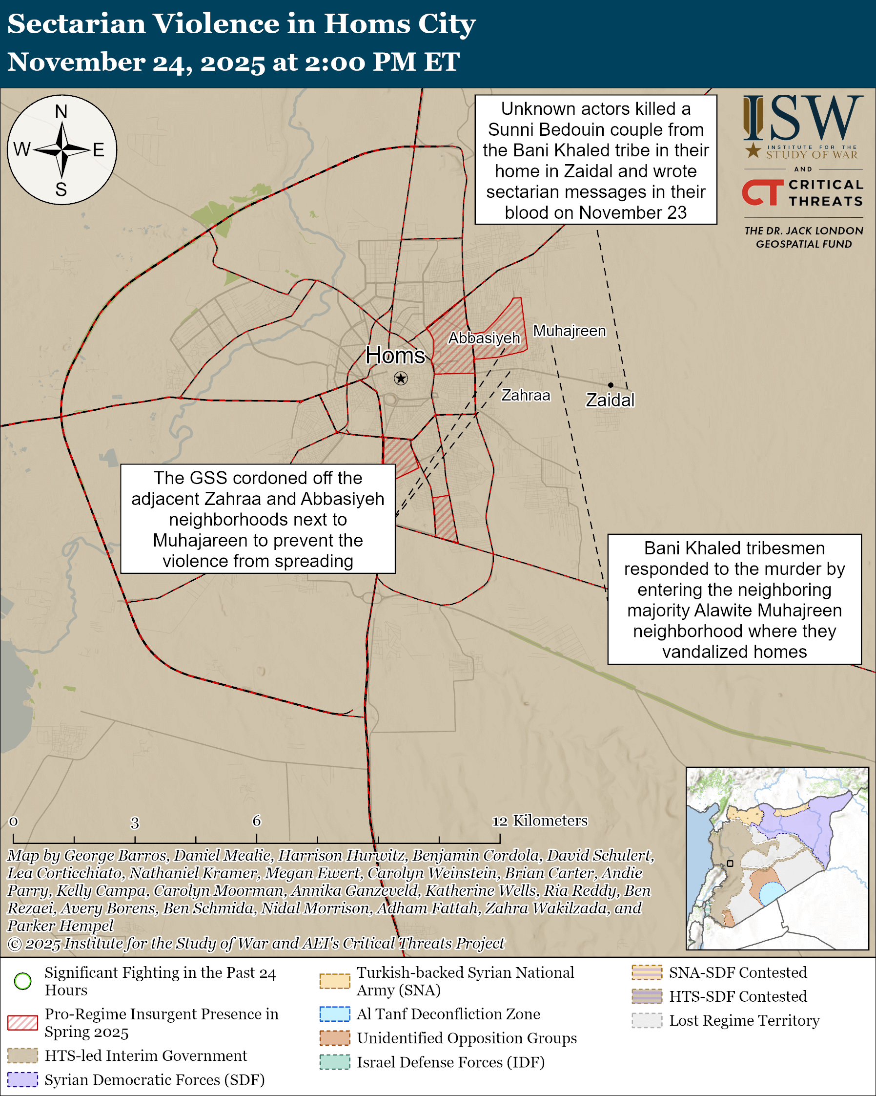 Unknown actors attempted to instigate sectarian conflict between Sunnis and Alawites in Homs City, but the responses of local security forces and residents contained the violence and prevented its spread or intensification. Unknown actors killed a Sunni Bedouin couple from the Bani Khaled tribe in their home in Zaidal, in the western outskirts of Homs City, on November 23.[xlvi] A Syrian source reported that unknown actors wrote sectarian slogans in the victim’s blood on the walls of the house in an attempt to incite widespread sectarian conflict in Homs City.[xlvii] One of the slogans was “Ya Hussein,” a Shia phrase that Alawites use.[xlviii] Zaidal neighbors several of Homs City’s Alawite-majority neighborhoods. Members of the Bani Khaled tribe vandalized homes in the neighboring majority Alawite Muhajreen neighborhood in response to the murder, according to an independent Syria researcher in Homs City.[xlix] The General Security Service (GSS) cordoned off Muhajareen‘s adjacent neighborhoods of Zahraa and Abbasiyeh to prevent the violence from spreading.[l] Bani Khaled tribesmen later broke through the GSS cordon and attacked Alawite and Sunni homes in the mixed Bedouin-Alawite neighborhood of Abbasiyeh.[li] The independent researcher emphasized that the GSS tried to contain the situation and restore order in western Homs, but struggled due to insufficient resources to cordon off hundreds of streets.[lii] The GSS reestablished control of Abbasiyeh after the Syrian Ministry of Defense (MoD) deployed fighters to the area and erected other barriers to prevent the violence from spreading.[liii] Unaffiliated Bedouin tribesmen also helped the GSS restrain Bani Khaled tribesmen in Abbasiyeh, which shows that the tensions were not strictly Sunni–Alawite.[liv] The GSS imposed a temporary curfew over Homs City.[lv] The combined efforts by the GSS and local Bedouins were critical in preventing the spread of sectarian violence in the area, such as how the deployment of Syrian forces exacerbated violence along the Syrian coast on March 6.[lvi] The GSS isolated the sectarian unrest in Homs through containment measures, cross-communal cooperation, and rapid intervention, which reduced the violence and prevented it from escalating into mutual sectarian reprisals. The Homs Health Directorate reported that 18 people were injured in Homs City on November 23 but did not report any deaths.[lvii]