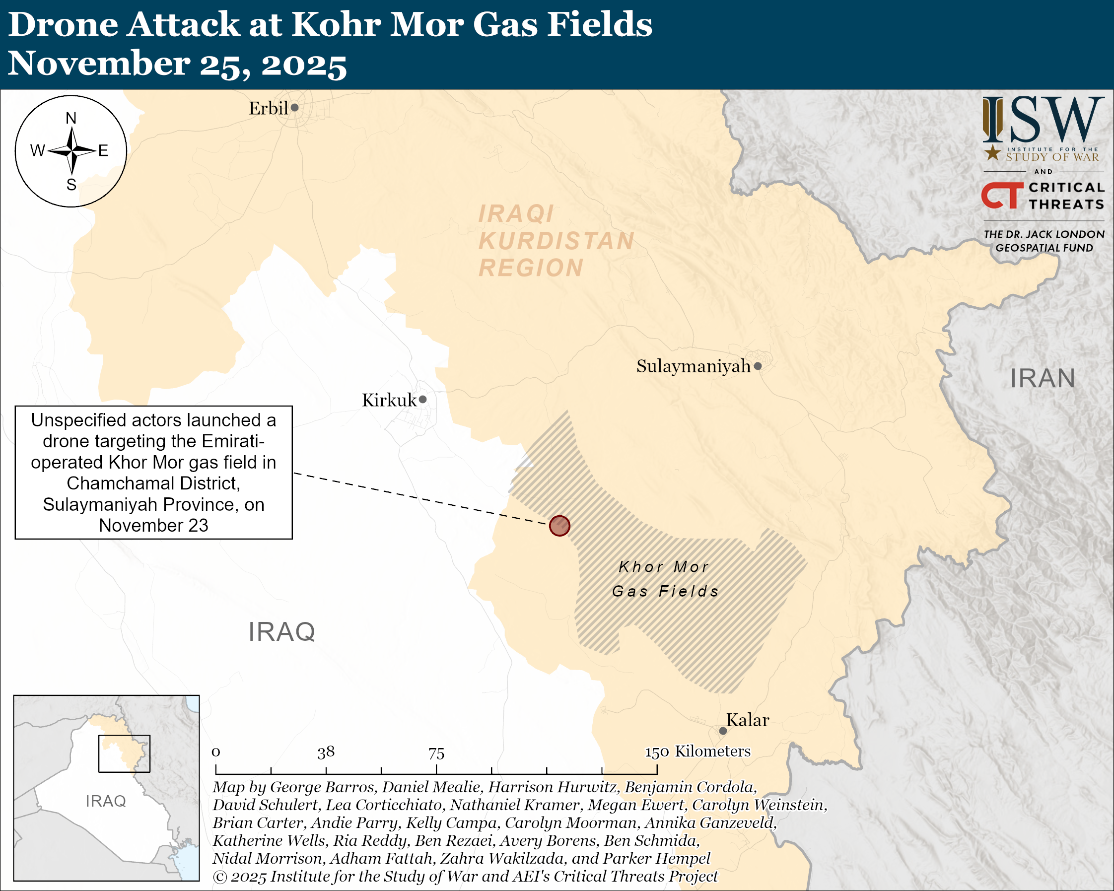 Unspecified actors launched a drone targeting the Emirati-operated Khor Mor gas field in Chamchamal District, Sulaymaniyah Province, Iraq, on November 23.[li] Kurdish security forces shot down the drone, according to a Kurdish media report on November 24.[lii] Two Emirati companies, Dana Gas and Crescent Petroleum, operate the gas field.[liii]