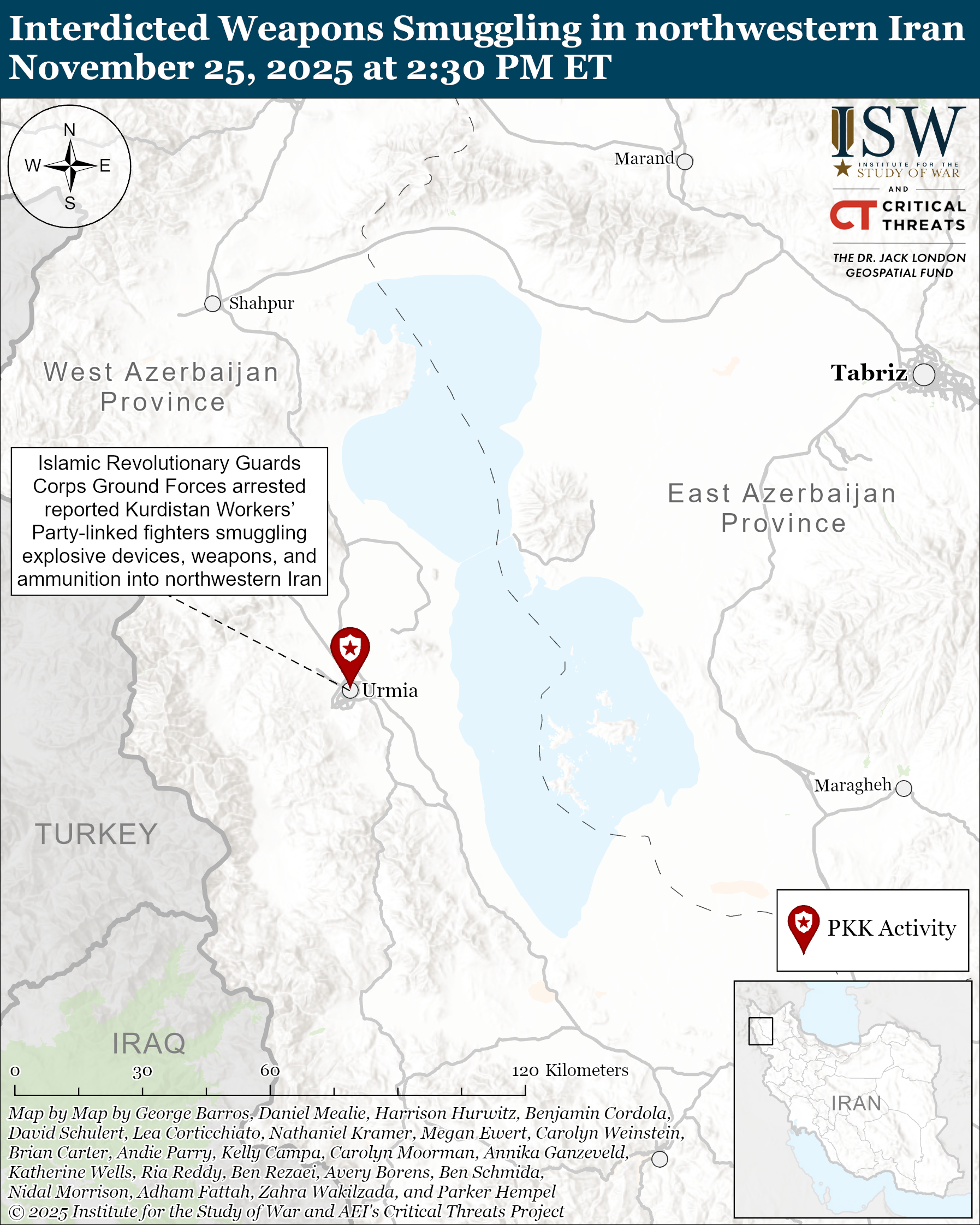 IRGC Ground Forces interdicted a shipment of explosive devices, weapons, and ammunition reportedly smuggled by Kurdistan Workers’ Party (PKK)-linked fighters into northwestern Iran on November 25.[xxxi] The PKK-linked fighters attempted to smuggle the weapons into Iran via the Kurdish-populated Tergever border near Urmia, West Azerbaijan Province. The PKK is a Kurdish militia group based in the Kurdish-majority areas of Iran, Iraq, Syria, and Turkey. The PKK announced in May 2025 that it would dissolve itself and “end its armed struggle.”[xxxii] The Kurdistan Free Life Party (PJAK), which is the Iranian branch of the PKK, announced in May 2025 that it would not adhere to the PKK’s decision to dissolve, however.[xxxiii] Iran and Turkey recently signed a memorandum of understanding (MoU) on October 30 to strengthen border security cooperation amid concerns about Kurdish fighters operating along their shared border.[xxxiv] Iran has previously accused Kurdish opposition groups of inciting protests in western Iran and cooperating with Israel to facilitate attacks in Iran.[xxxv]