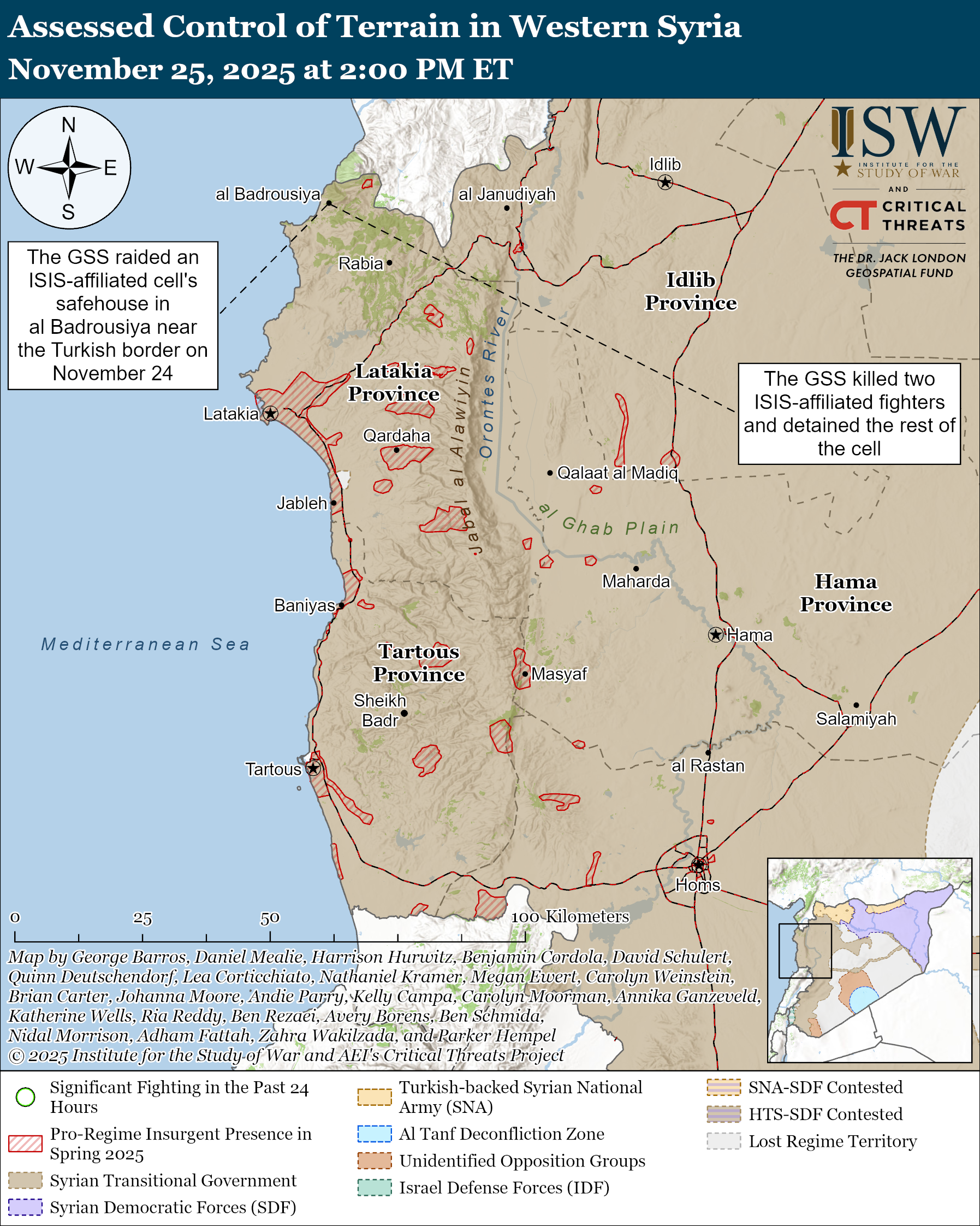 Syrian authorities dismantled an Islamic State in Iraq and al Sham (ISIS)-affiliated cell in Latakia Province, indicating that ISIS-affiliated groups may seek to conduct clandestine activities or attacks in coastal Syria. The Syrian General Security Service (GSS) raided an ISIS-affiliated cell’s safehouse in al Badrousiya, Latakia Province, on November 24.[xix] The Syrian Ministry of Interior (MoI) reported on November 24 that the GSS killed two fighters and arrested the rest of the cell.[xx] The cell injured one GSS member during the raid.[xxi] The GSS also seized “medium and light weapons” from the cell’s safehouse, according to Syrian media.[xxii] The GSS Latakia Province commander said on November 24 that the cell “was planning to carry out terrorist operations on the Syrian coast.”[xxiii]