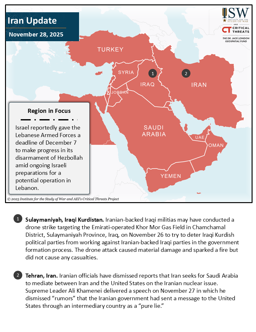 Note: Today’s Iran Update covers data between 2:00 PM ET on November 26, 2025, and 2:00 PM ET on November 28, 2025, as CTP-ISW did not publish an Iran Update on November 27 in observance of the Thanksgiving holiday.