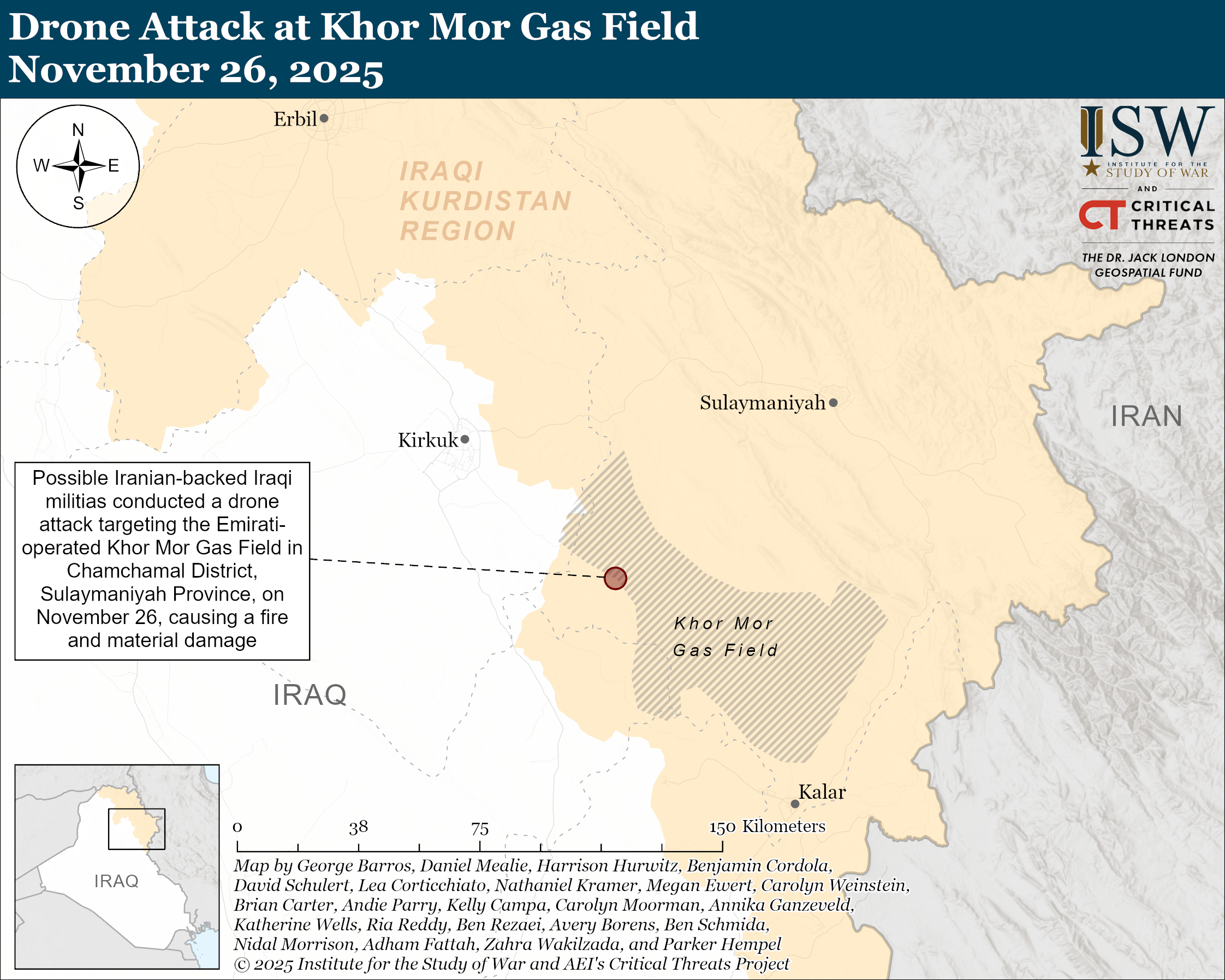 - Drone Attack in Iraqi Kurdistan: Iranian-backed Iraqi militias may have conducted a drone strike targeting the Emirati-operated Khor Mor Gas Field in Chamchamal District, Sulaymaniyah Province, Iraq, on November 26 to try to deter Iraqi Kurdish political parties from working against Iranian-backed Iraqi parties in the government formation process. The drone attack caused material damage and sparked a fire but did not cause any casualties.