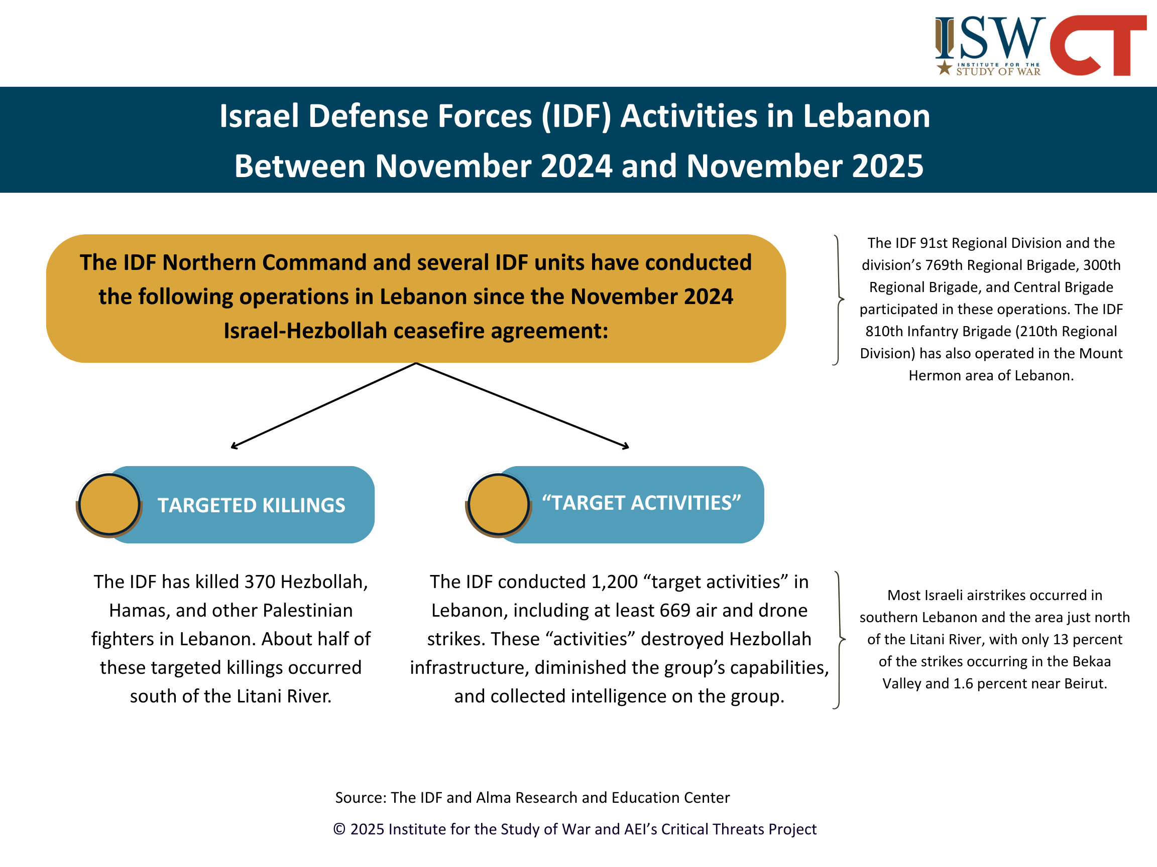 Israel reportedly gave the Lebanese Armed Forces (LAF) a deadline of December 7 to make progress in its disarmament of Hezbollah amid ongoing Israeli preparations for a potential operation in Lebanon.[i] An Israeli Channel 13 journalist reported on November 28 that the LAF has until after Pope Leo XIV and US Deputy Special Envoy Morgan Ortagus’s upcoming visits to Beirut to show unspecified progress on its disarmament plan.[ii] Pope Leo XIV will visit Beirut between November 30 and December 2, and Ortagus will visit Beirut on December 5 and 6.[iii] Israel has simultaneously continued to prepare for a potential operation in Lebanon. Israeli Prime Minister Benjamin Netanyahu held a “special discussion” with Israeli defense officials on November 27, during which the defense officials presented operational plans to continue “enforcement activities” and prevent Hezbollah reconstitution.[iv] Israel’s reported deadline comes amid Israeli officials’ frustration with the LAF’s lack of progress on its plan to disarm Hezbollah and repeated warnings about a potential Israeli operation in Lebanon.[v] Israeli officials told Israeli media on November 27 that Israel is “running out of patience” over the LAF’s continued delays and reiterated how Hezbollah is working to reconstitute its military capabilities and infrastructure.[vi] The officials warned that Hezbollah’s reconstitution activities may lead to increased Israeli operations along Israel’s northern border.[vii] Israel has consistently conducted air and drone strikes in Lebanon as well as targeted killings to prevent Hezbollah reconstitution since the November 2024 Israel-Lebanon ceasefire agreement.[viii] US officials have also expressed frustration over the LAF’s lack of progress.[ix] US President Donald Trump recently warned the Lebanese government that Israel will launch an operation if the LAF does not disarm Hezbollah by the end of 2025, according to the Israeli Channel 13 journalist.[x]