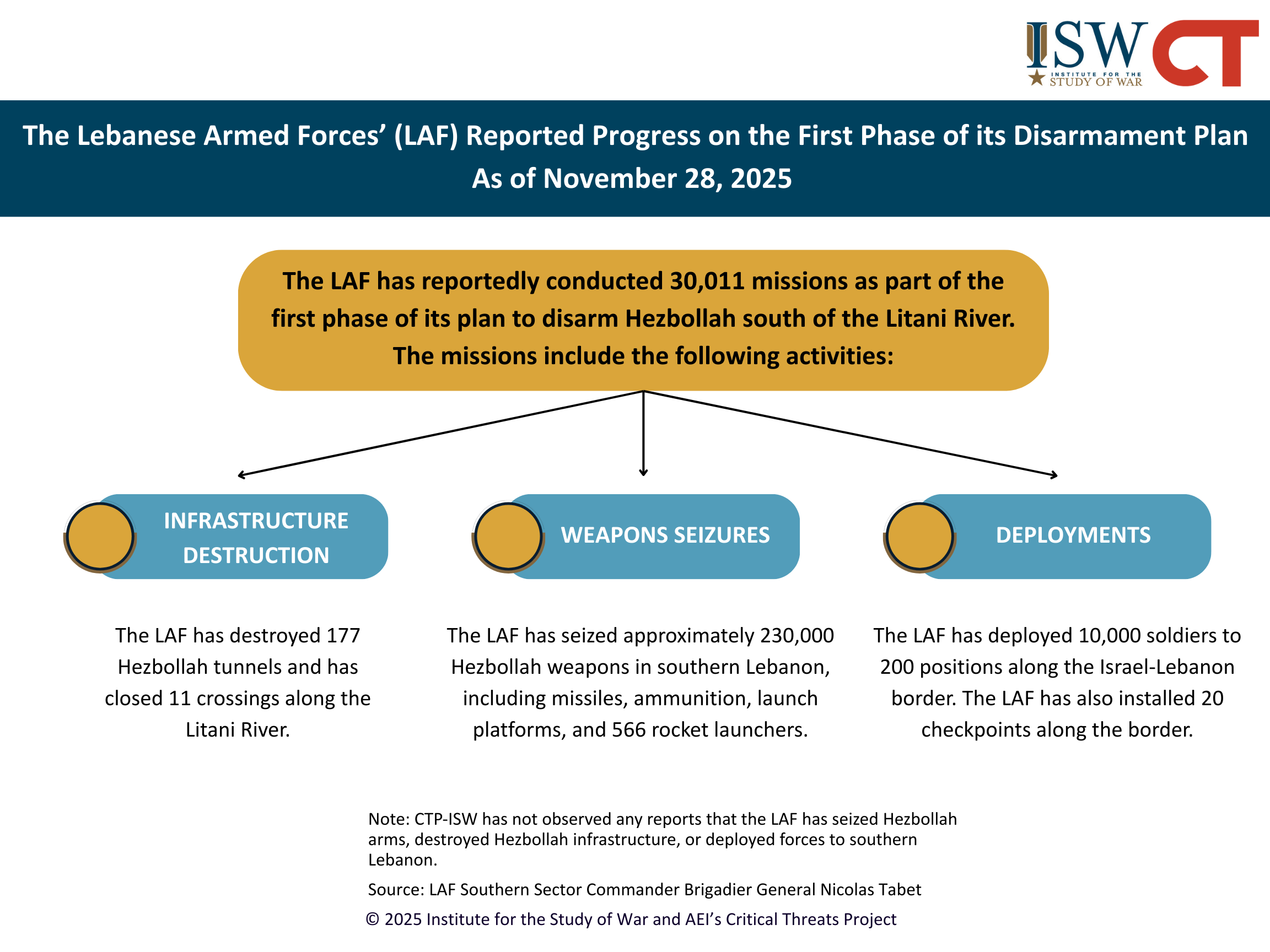 The LAF has continued to reject Israeli and US statements about its lack of progress in disarming Hezbollah, claiming that the LAF has made significant progress in its disarmament plan.[xi] LAF Southern Sector Commander Brigadier General Nicholas Tabet stated on November 28 that the LAF has implemented 80 percent of its disarmament plan in southern Lebanon and noted that the LAF will not request an extension for its end-of-year deadline.[xii] CTP-ISW has not observed any reports that the LAF has seized arms from Hezbollah fighters or raided any active Hezbollah sites with Hezbollah personnel present, however. Tabet claimed that Israel has failed to cooperate with the LAF and the Lebanese state, stating that Israel has not provided the LAF with evidence that new weapons are entering southern Lebanon.[xiii] Israel has consistently stated that Hezbollah is replenishing its weapons stockpiles in southern Lebanon.[xiv] Tabet also claimed that most of the private homes in southern Lebanon that Israel has recently targeted were civilian homes.[xv] Hezbollah has historically used civilian homes to store weapons.[xvi] The LAF reportedly requested that the ceasefire monitoring committee inspect the private homes prior to Israeli airstrikes.[xvii] Israel reportedly rejected this request and “insisted” on targeting the private homes, according to Tabet.[xviii] Lebanese and LAF officials have consistently stated that continued Israeli operations in Lebanon are preventing the LAF from fully deploying to southern Lebanon and hindering the LAF’s ability to disarm Hezbollah.[xix]