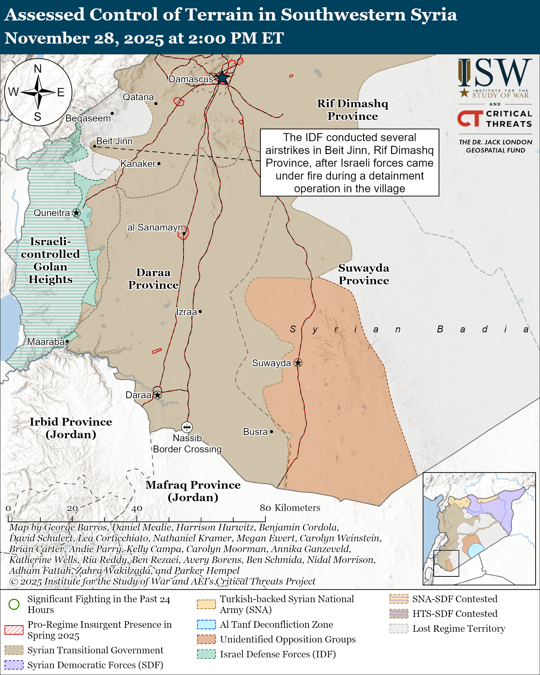 The Israel Defense Forces (IDF) conducted several airstrikes in Beit Jinn, Rif Dimashq Province, on November 28.[xlvii] The 55th Reserve Paratroopers Brigade (210th Division) initially entered Beit Jinn to detain three villagers that the IDF said were al Jamaa al Islamiyya members planning to attack Israeli citizens.[xlviii] Al Jamaa al Islamiyya is a Lebanese Muslim Brotherhood splinter, and its fighters have previously engaged Israeli forces in southern Lebanon.[xlix] An al Jamaa al Islamiyya representative to the Lebanese Parliament denied that the organization has members in southern Syria.[l] Israeli forces came under fire during the detainment operation.[li] Israeli forces engaged locals in Beit Jinn on November 28, killing 13 villagers and injuring 20 others, according to Syrian media.[lii] The engagement injured six Israeli soldiers.[liii] Syrian Foreign Minister Asaad al Shaibani condemned the “persistence” of Israeli operations in Syria and said that such operations “threaten regional peace and security.”[liv] Israel’s public broadcaster reported that Israeli Defense Minister Israel Katz told the Israeli Foreign Affairs and Defense Committee on November 26 that Israel is "not on track" for peace with Syria.[lv] Katz also told the committee that there are several armed groups, including the Houthis, operating in southern Syria that are considering a ground operation into the Israeli-controlled Golan Heights.[lvi] Katz’s statements highlight Israel’s heightened threat perception of southern Syria.