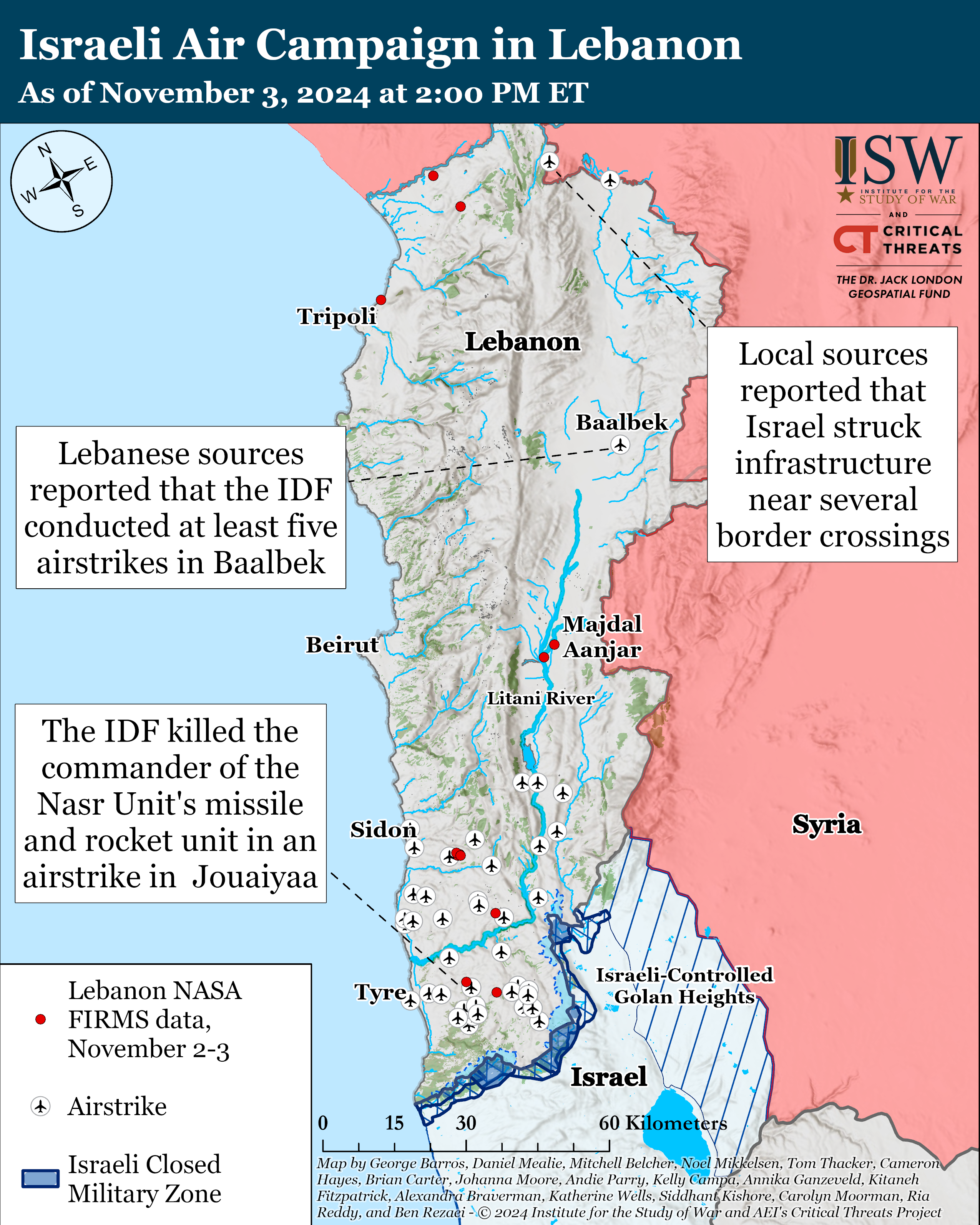 Israeli Prime Minister Benjamin Netanyahu stated that Israel needs to push Hezbollah north of the Litani River “with or without an agreement” to achieve Israel's stated war aims.[xii] Israel’s stated war aim is to return residents of northern Israel to their homes under safe conditions.[xiii] Current Israeli operations in southern Lebanon are unlikely to achieve these war aims, though it does not follow that future Israeli operations will fail to achieve the Israeli objectives. Netanyahu made these remarks during a visit to the Israel-Lebanon border on November 3 to meet with IDF commanders.[xiv] Israel has designed its current ground operations to dismantle border infrastructure and prevent Hezbollah from conducting direct fire and ground attacks into Israel.[xv] These operations do not seek to physically push Hezbollah fighters north of the Litani River and have not done so.