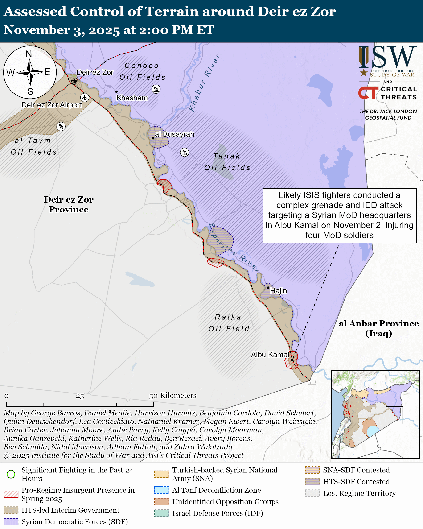 - Likely ISIS Attack in Deir ez Zor, Syria: ISIS likely conducted a complex grenade and improvised explosive device attack targeting a Syrian Ministry of Defense headquarters in Albu Kamal, Deir ez Zor Province, on November 2. The attack’s target, as well as the weapons used, mirror ISIS’s previous attacks on government forces in Deir ez Zor Province.