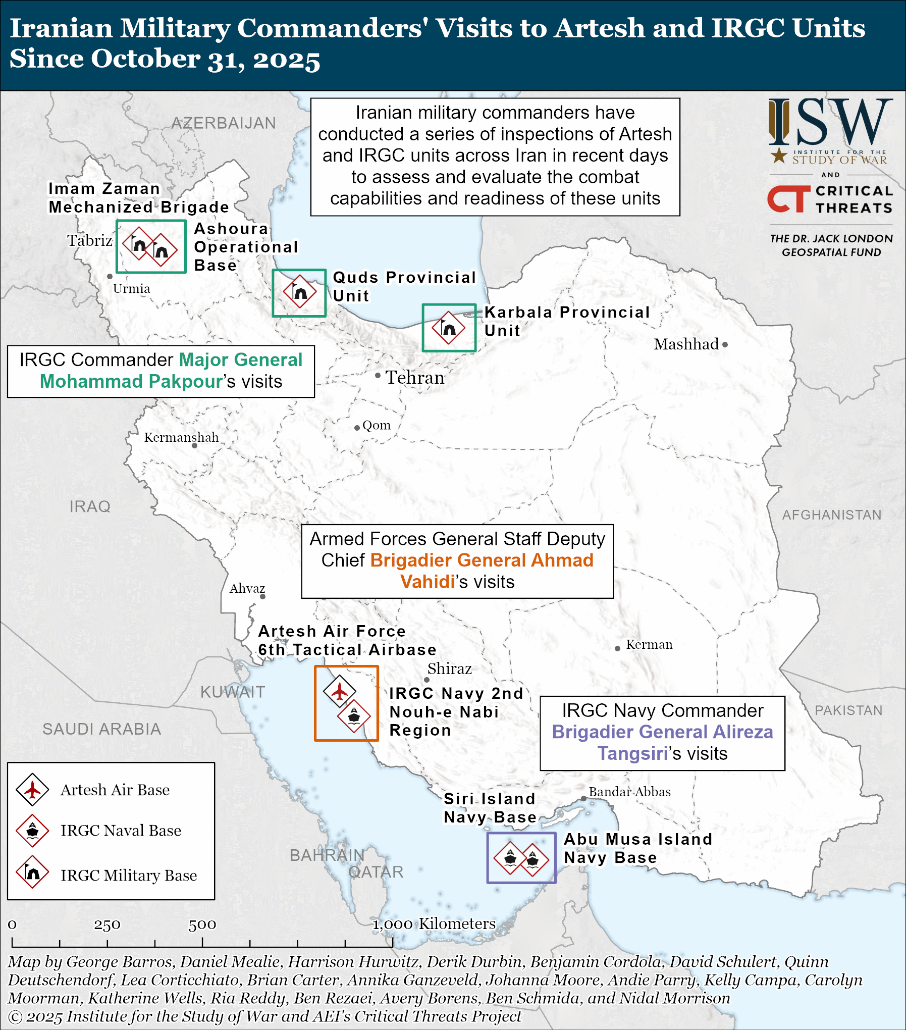 - IRGC Ground Forces Provincial Units: Pakpour met with Ashoura Provincial Unit personnel in East Azerbaijan Province on November 1. The Ashoura Unit is located near the Southwest Tabriz Missile Base.[xix] Israeli airstrikes during the war destroyed a missile launch control center, one storage tunnel, an air defense battery, and two stationary launchers at the site.[xx] Pakpour also visited the IRGC Ground Forces Karbala and Quds provincial units, which are based in Mazandaran Province and Gilan Province, respectively.[xxi]