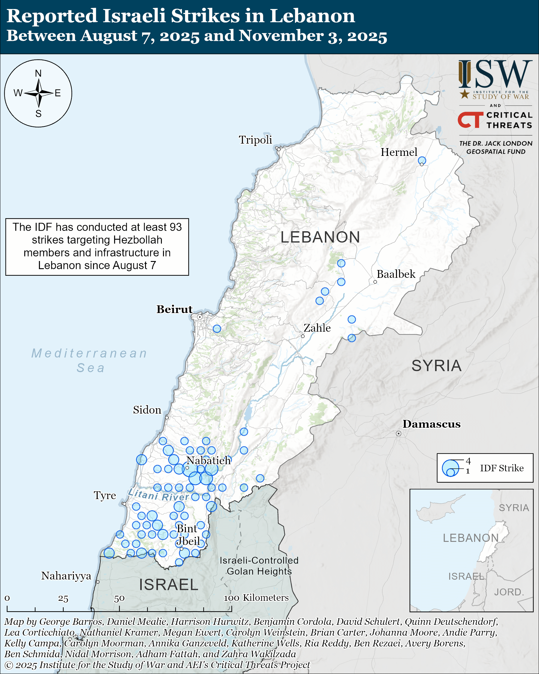 Senior Israeli officials have warned that Israel may increase its rate of operations in Lebanon due to the Lebanese Armed Forces’ limited progress in disarming Hezbollah and reports about Hezbollah reconstitution.[xlv] Israeli Prime Minister Benjamin Netanyahu and Defense Minister Israel Katz stated on November 2 that the IDF will continue to operate in Lebanon to “defend” Israel until the Lebanese government disarms Hezbollah.[xlvi] Katz also said that the IDF may intensify its efforts to enforce the Israel-Hezbollah ceasefire to protect northern Israeli residents.[xlvii] Israeli media reported on November 2 that Israeli intelligence and the IDF Northern Command identified that Hezbollah has begun to rebuild military infrastructure in several regions in Lebanon, including north of the Litani River, the Jordan Valley, and south of Beirut. Israeli media also reported that Hezbollah is collecting weapons from Hezbollah infrastructure that the IDF previously struck.[xlviii] An Israeli official told Saudi media on November 2 that Israel warned the Lebanese government that it may strike Beirut’s southern suburbs if the Lebanese government does not disarm Hezbollah.[xlix] This message comes amid growing Israeli frustration with the Lebanese state’s slow progress to disarm Hezbollah. CTP-ISW has not observed any reports of the LAF seizing arms from Hezbollah fighters or raiding active Hezbollah sites. US and European officials have recently warned about the possibility of a large-scale Israeli operation targeting Hezbollah if Lebanon continues to make limited progress to disarm Hezbollah.[l]