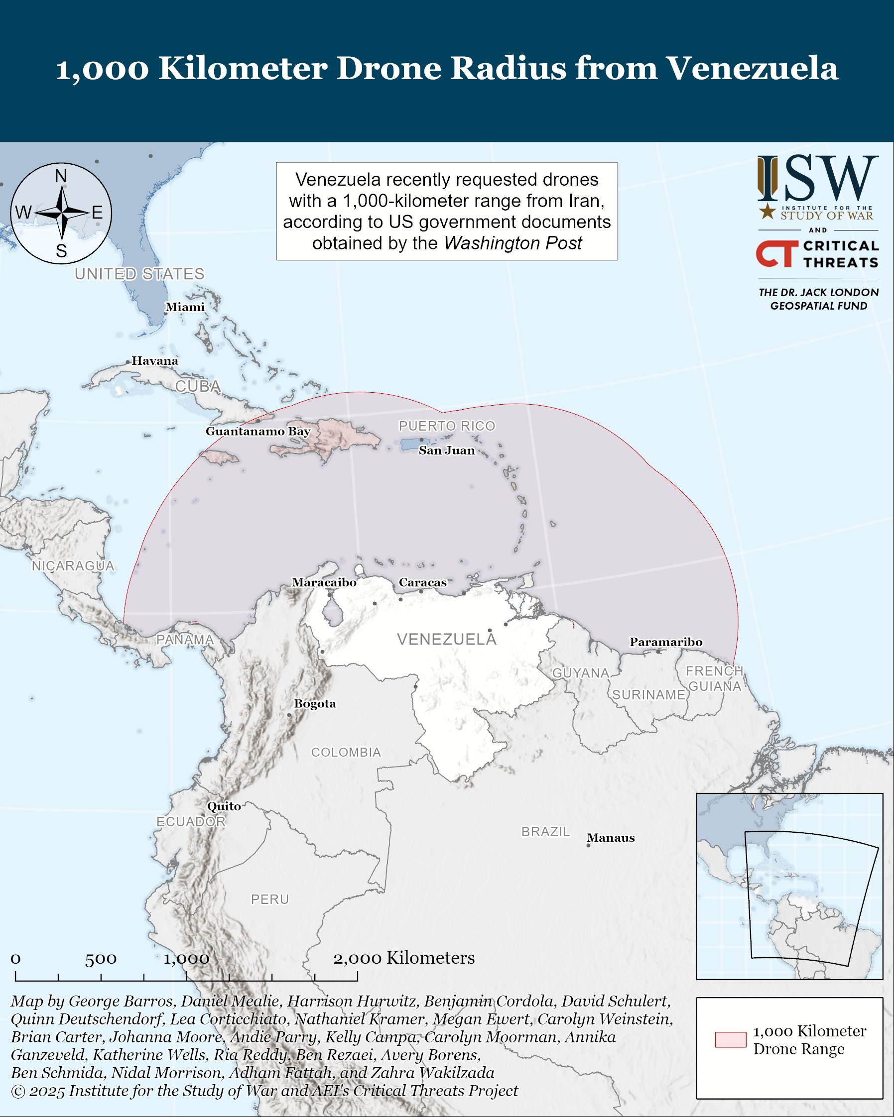 - Venezuelan Request for Iranian Military Equipment: Venezuela recently requested military equipment, including drones, from Iran amid heightened tensions between Venezuela and the United States, according to internal US government documents obtained by the Washington Post. It is unclear if Iran is willing and able to export drones and other military equipment to Venezuela after the Israel-Iran War, however.
