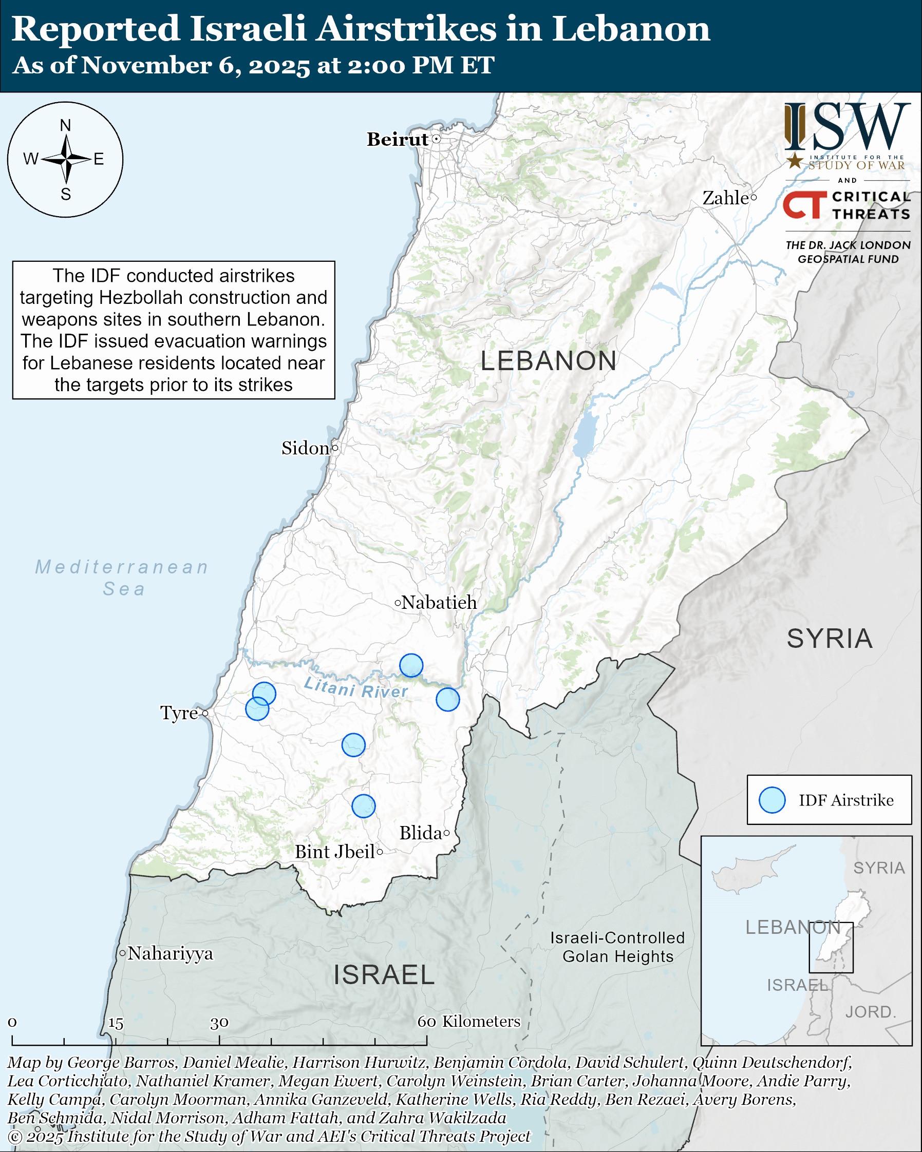 Lebanese, US, and Israeli officials said that they are prepared to hold negotiations between Israel and Lebanon. Informed sources told Lebanese media on November 5 that the United States seeks political negotiations between Israel and Lebanon, and has noted that US Special Envoy Thomas Barrack would be willing to oversee the negotiations in any city that Lebanon chooses.[xxxiii] The sources added that the United States and Israel have appointed unspecified officials to participate in these negotiations.[xxxiv] It is unclear whether these officials have agreed or been approved to participate. Lebanese President Joseph Aoun has reiterated his openness to negotiate with Israel to ”end tensions.”[xxxv] Neither Lebanon nor Israel has changed its position on key outstanding issues, however. Unspecified military sources told Saudi media on November 6 that the second phase of the Lebanese Armed Forces (LAF)’s disarmament plan, which focuses on areas north of the Litani River, is linked to ”political developments and the Israeli position on negotiations.”[xxxvi] Aoun previously noted that Lebanese officials would not participate in negotiations with Israel until Israel ceases its operations and fully withdraws from southern Lebanon.[xxxvii] Israel has maintained that it will continue to operate in Lebanon until Hezbollah has been disarmed.[xxxviii]