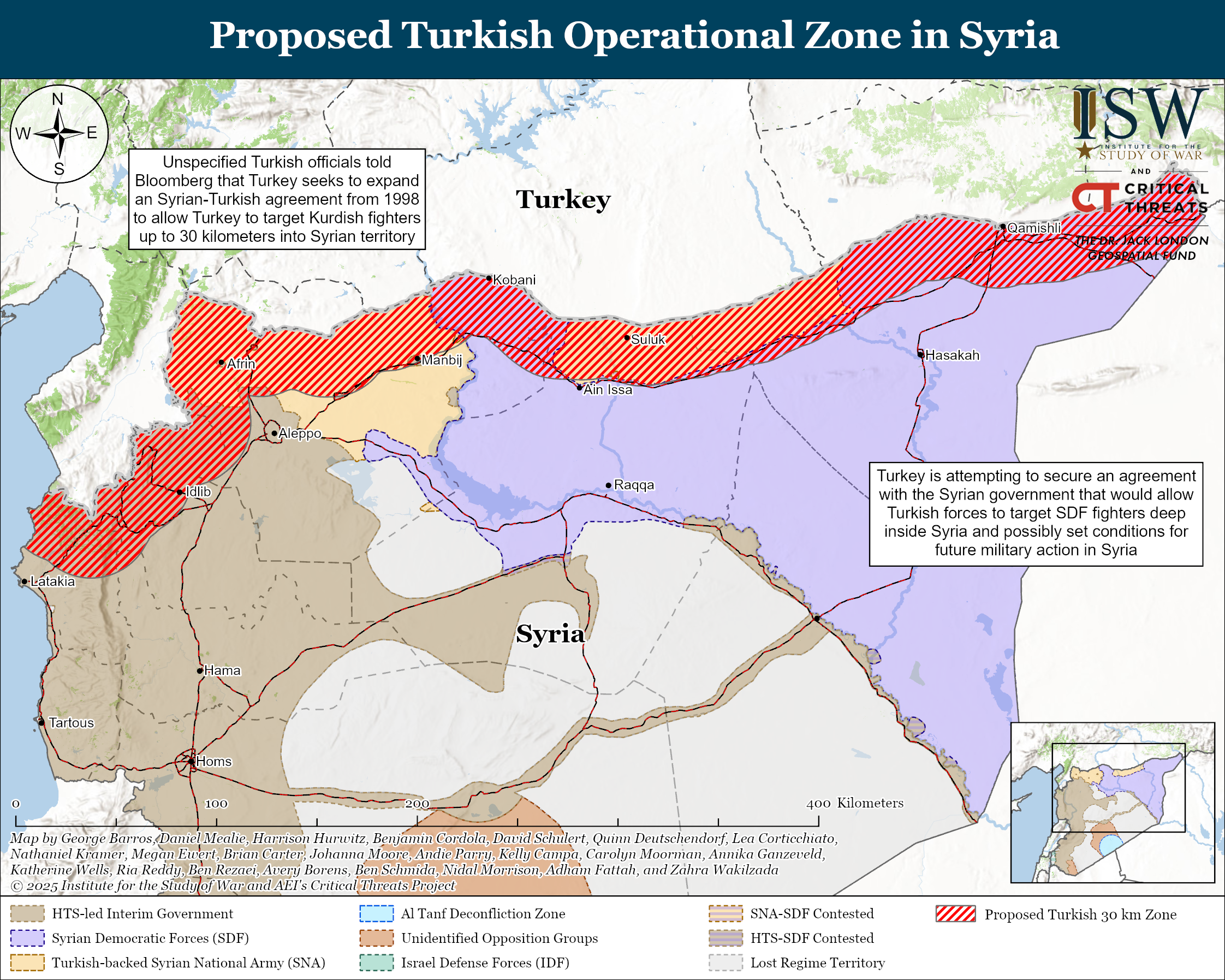 Turkey is attempting to secure an agreement with the Syrian government that would allow Turkish forces to target Syrian Democratic Forces (SDF) fighters deep inside Syria and possibly set conditions for future military operations targeting the SDF. Unspecified Turkish officials told Bloomberg on October 17 that Turkey and Syria have discussed expanding the 1998 Adana Agreement so that it allows Turkey to target Kurdish fighters up to 30 kilometers in Syrian territory.[xvii] The 1998 Adana Agreement, which the Turkish government signed with the Assad regime, currently allows Turkey the right to target Kurdish fighters it deems a threat up to five kilometers into Syrian territory.[xviii] Turkish President Recep Tayyip Erdogan used this agreement to justify Turkey’s right to launch a military offensive targeting the SDF in 2019, citing the Assad regime’s lack of “measures” taken to rein in Kurdish fighters near the border.[xix] Turkey has recently threatened to take military action against the SDF—which it views as an extension of the Kurdistan Workers’ Party—by the end of 2025 if the SDF does not integrate into the Syrian state by that date.[xx] Turkey's ability to target the SDF deeper in Syrian territory would allow Turkey to set conditions for possible future military operations targeting the SDF, including by targeting key SDF tactical and operational commanders within the 30-kilometer operational zone. Turkey has previously struck SDF forces deep into Syria—much deeper than 30 kilometers—but an amendment to the 1998 Adana Agreement would enable ground pursuit and help alleviate any possible friction with the new Syrian government.