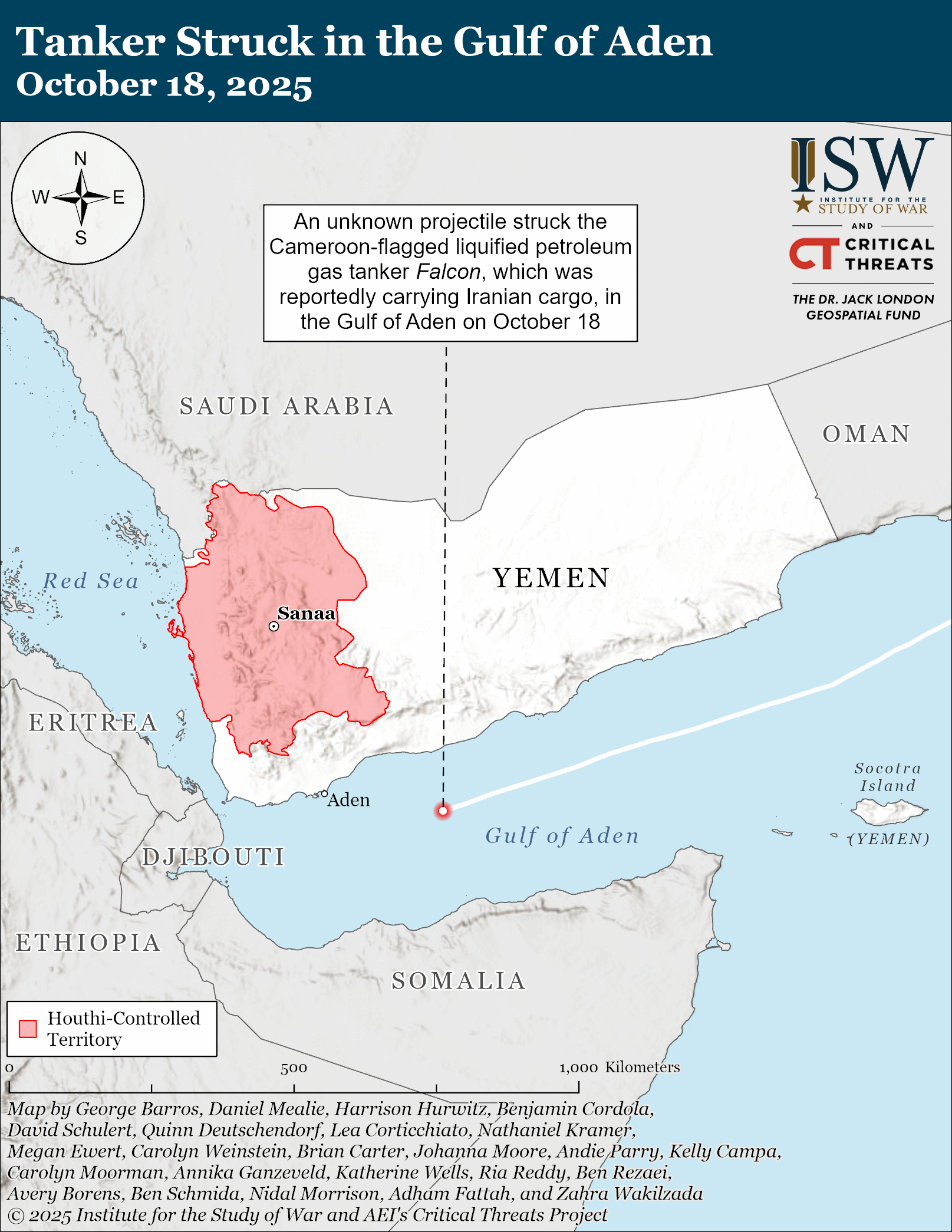 An unknown projectile struck the Indian-owned, Cameroon-flagged liquefied petroleum gas tanker Falcon, which was reportedly carrying Iranian cargo, in the Gulf of Aden on October 18.[lxxxvii] Tanker Trackers assessed that the tanker was most likely headed to Ras Issa, Yemen, to supply the Houthis with fuel.[lxxxviii] The Falcon is part of Iran's ghost fleet that illicitly transports oil and petroleum products, according to United Against Nuclear Iran.[lxxxix] Iran denied that the vessel is affiliated with Iran.[xc] The vessel has not visited Iran since at least April 2020 and last docked at the Khawr al Zubair Terminal in Basra, Iraq, in October 2024, according to commercially available maritime data.