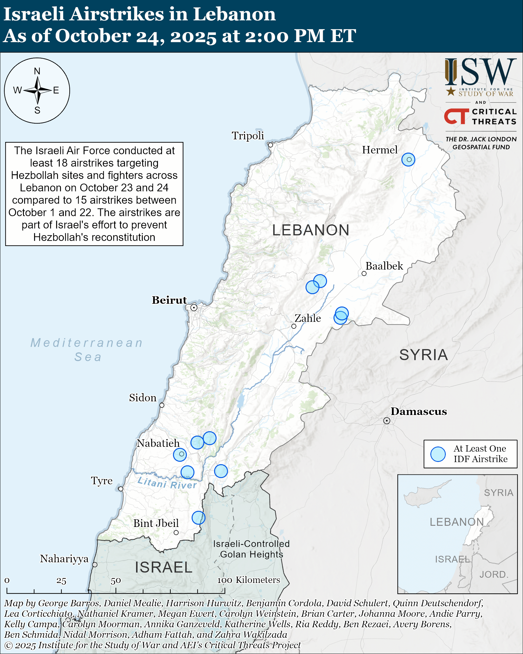 The Israeli Air Force (IAF) conducted at least 18 airstrikes targeting Hezbollah sites and fighters across Lebanon on October 23 and 24, compared to 15 airstrikes between October 1 and 22. The airstrikes are part of Israel’s effort to prevent Hezbollah’s reconstitution.[i] Five IAF fighter jets struck 16 Hezbollah sites, including a training camp and a missile manufacturing site, in the Bekaa Valley and northern Lebanon on October 23.[ii] The Bekaa Valley has historically served as a Hezbollah stronghold and a key center for Hezbollah military activities.[iii] The IAF struck other Hezbollah sites and fighters in southern Lebanon on October 23 and 24.[iv] The IAF killed Hezbollah’s southern Lebanon Logistics Unit Chief, Abbas Hassan Karaki, on October 24.[v] The Israel Defense Forces (IDF) stated that Karaki was responsible for leading Hezbollah’s efforts to rebuild its capabilities and infrastructure in southern Lebanon.[vi] Israel has consistently stated that the Lebanese government is not doing enough to disarm Hezbollah and prevent the group’s reconstitution.[vii]