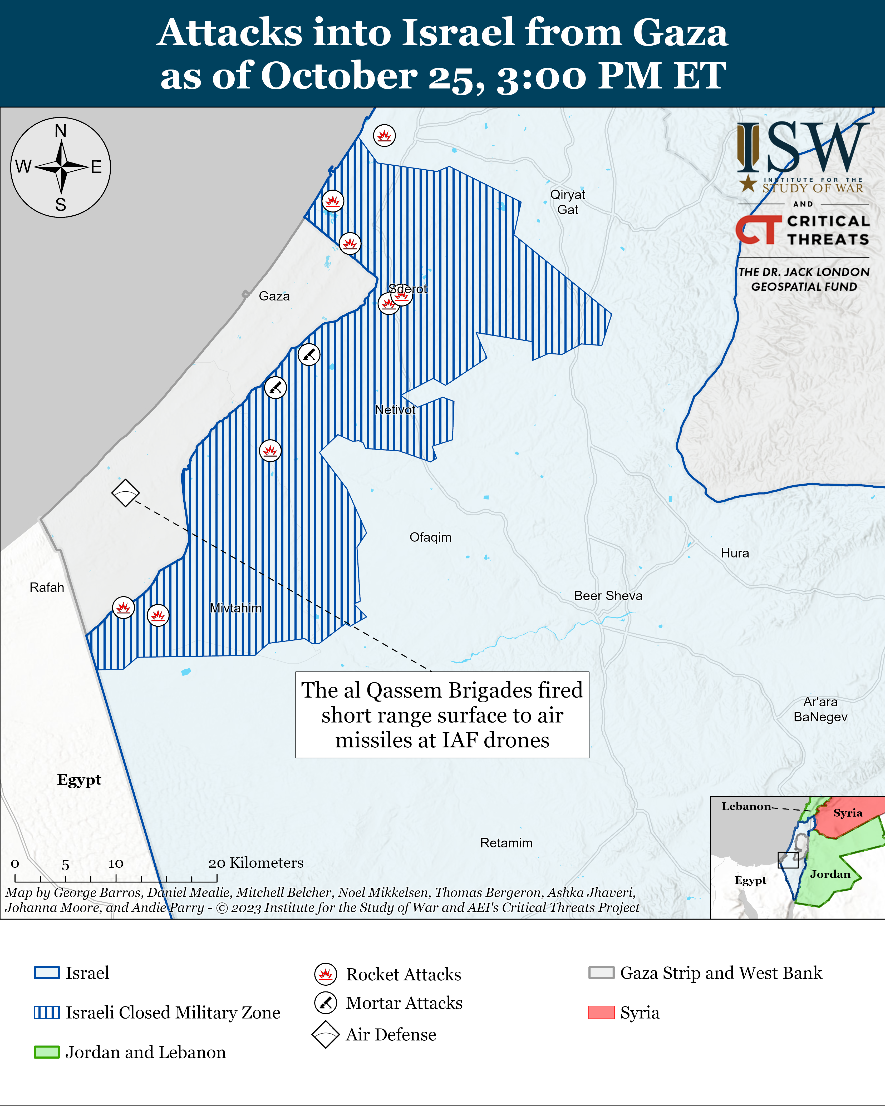 Palestinian militias continued attacks at the usual rate from the Gaza Strip into Israel on October 25. The al Qassem Brigades—Hamas’ militant wing—claimed responsibility for seven indirect fire attacks.[xxiii] Saraya al Quds—the militant wing of Palestinian Islamic Jihad (PIJ)—claimed responsibility for six rocket attacks.[xxiv] The National Resistance Brigades —the militant wing of the Democratic Front for the Liberation of Palestine—claimed responsibility for two mortar and rocket attacks.[xxv] Axis of Resistance-affiliated media reported two other unclaimed rocket attacks.[xxvi] This rate of attacks is consistent with the rate that CTP-ISW has observed in recent days.