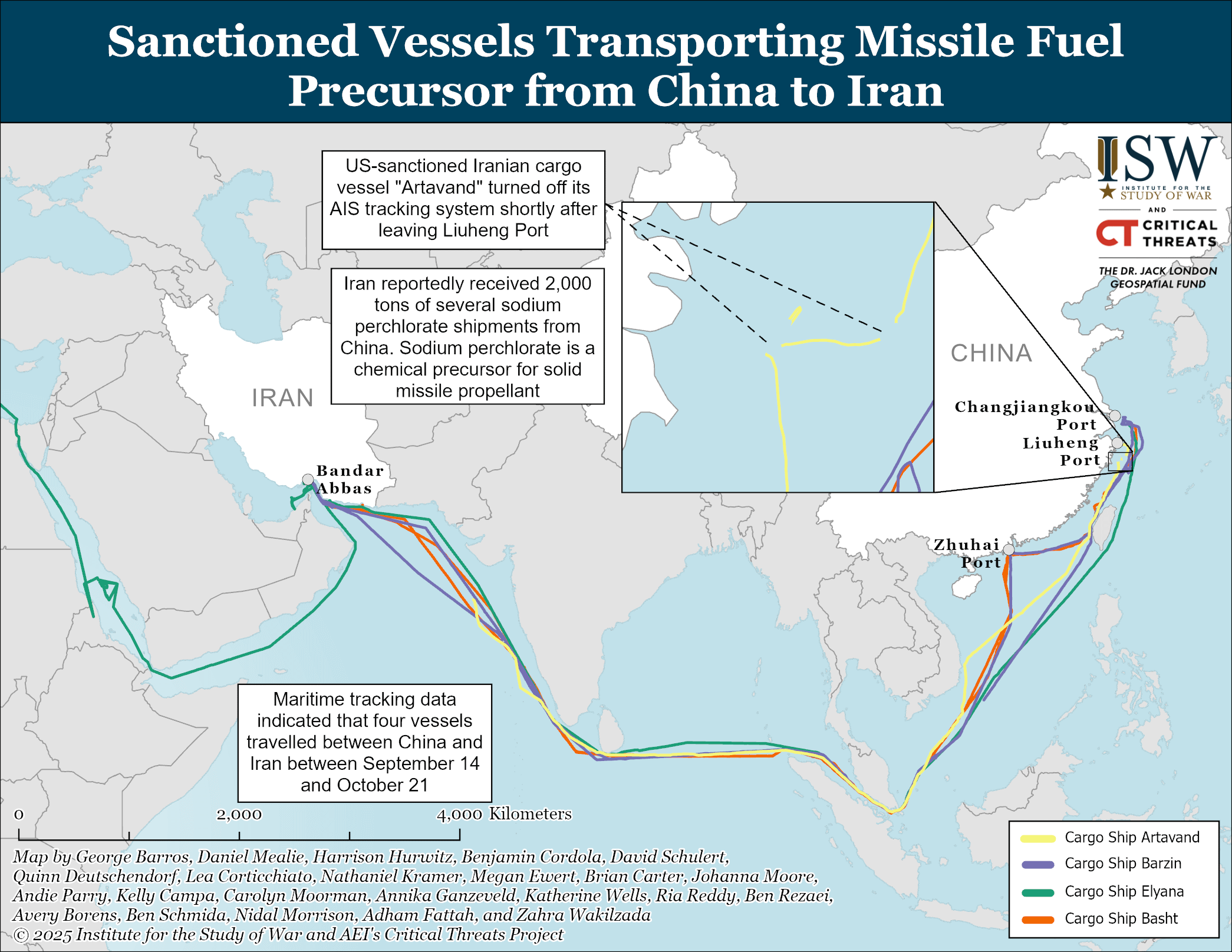 Iran has reportedly received increasingly large sodium perchlorate shipments from China amid Iranian efforts to rebuild its ballistic missile program in the wake of Israel-Iran war. European intelligence sources told CNN on October 29 that Iran received 2000 tons of sodium perchlorate in several shipments that arrived in Bandar Abbas, Iran, from China.[i] Sodium perchlorate is a chemical precursor for solid missile propellant. The Associated Press assessed on September 24 that Iran does not have the necessary planetary mixers to produce solid missile fuel due to Israeli strikes on Iranian military sites in October 2024 and June 2025, however.[ii] Iran has reportedly received larger quantities of sodium perchlorate in recent shipments compared to the quantities of sodium perchlorate that Iran previously received from China in February and May 2025.[iii] These shipments notably arrived in Iran on September 29, two days after the UN Security Council reimposed sanctions on Iran that included sanctions related to the Iranian missile program.[iv] China has recently assisted Iran in developing its ballistic missile program through shipments of sodium perchlorate in addition to other dual-use technologies.[v] Iran reportedly received about 1000 tons of sodium perchlorate from China in February and May 2025.[vi] The larger recent shipments to Iran come as Iran tries to rebuild its missile program following the Israel-Iran War in June 2025. Former Islamic Revolutionary Guards Corps (IRGC) Commander Mohammad Ali Jafari argued on October 25 that Iran’s missile program is its main form of deterrence and that Iran deliberately prioritized developing its missile and drone capabilities over its air and ground forces to counter the superior capabilities of the United States and Israel.[vii]