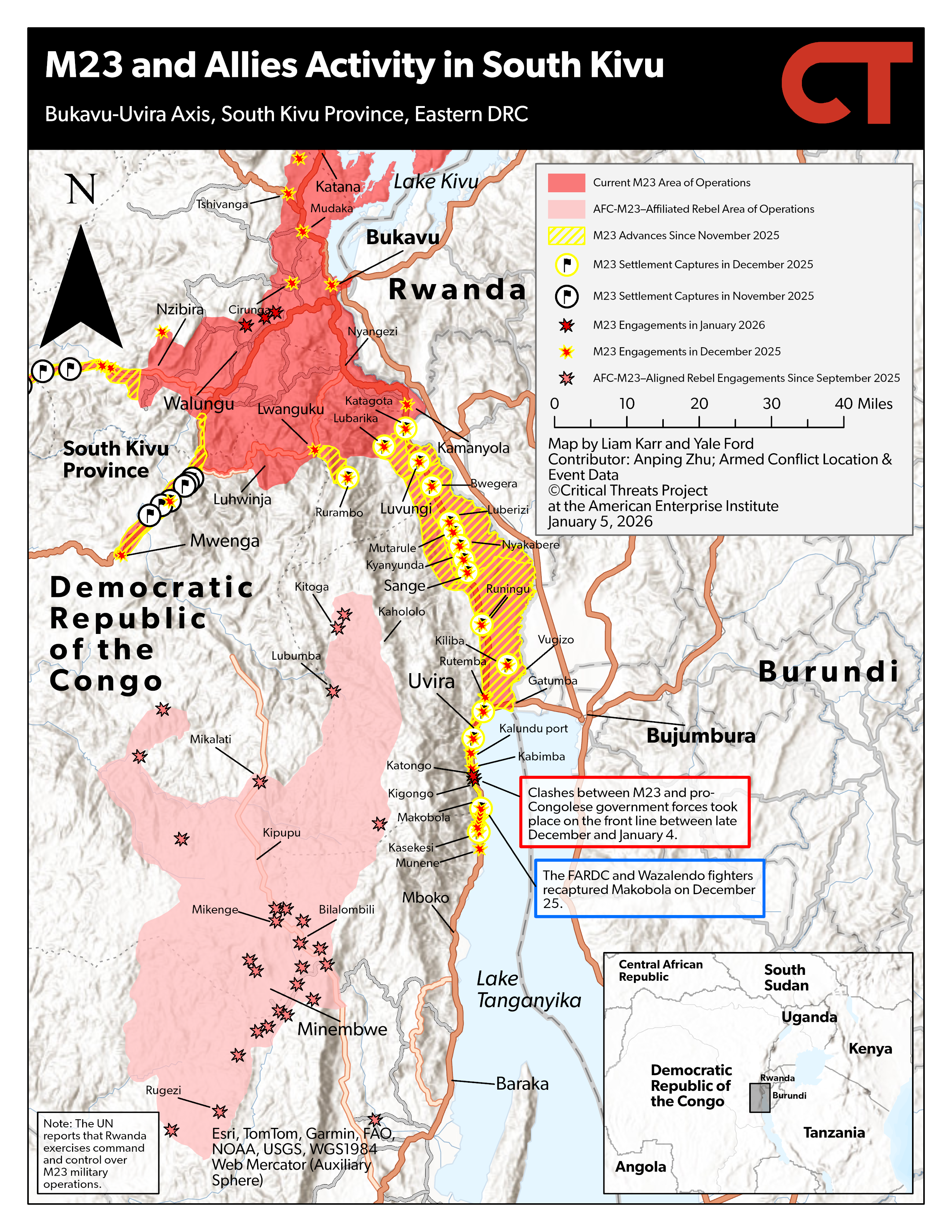 [126] https://www.criticalthreats.org/briefs/congo-war-security-review/january-5-2026; https://www.rfi.fr/fr/afrique/20251230-rdc-des-combats-se-poursuivent-autour-d-uvira-o%C3%B9-une-administration-parall%C3%A8le-s-installe; https://www.rfi.fr/fr/afrique/20260101-rdc-kinshasa-exige-une-nouvelle-fois-le-retrait-de-l-afc-m23-de-la-ville-d-uvira; https://x.com/TazamaRDC_Infos/status/2006141732451217924