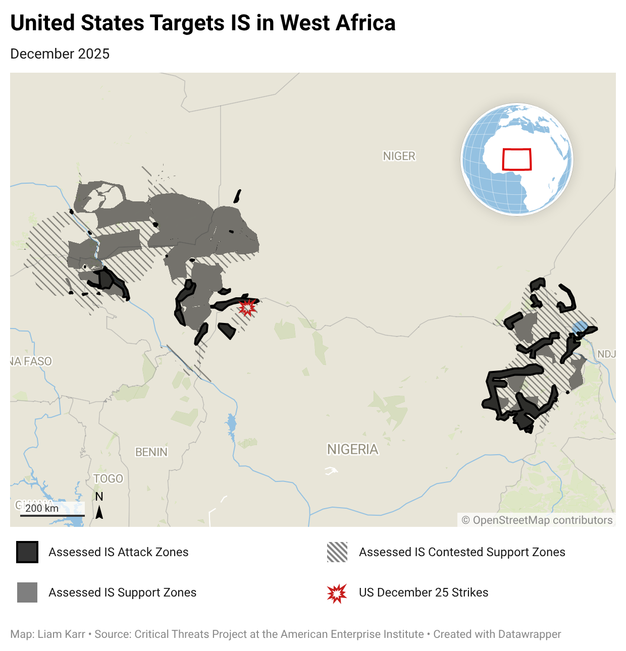 The United States conducted missile strikes against IS-linked militants in northwestern Nigeria on December 25. US ships in the Gulf of Guinea fired more than a dozen Tomahawk cruise missiles targeting IS-linked camps in the Tangaza area of northwest Nigeria’s Sokoto state.[62] United States Africa Command (AFRICOM) released a statement saying that the strikes targeted ISIS terrorists and was carried out in coordination with Nigerian officials.[63] A local researcher said that at least 100 fighters were killed and 200 are missing, but there has been no independent or government confirmed casualty count.[64]