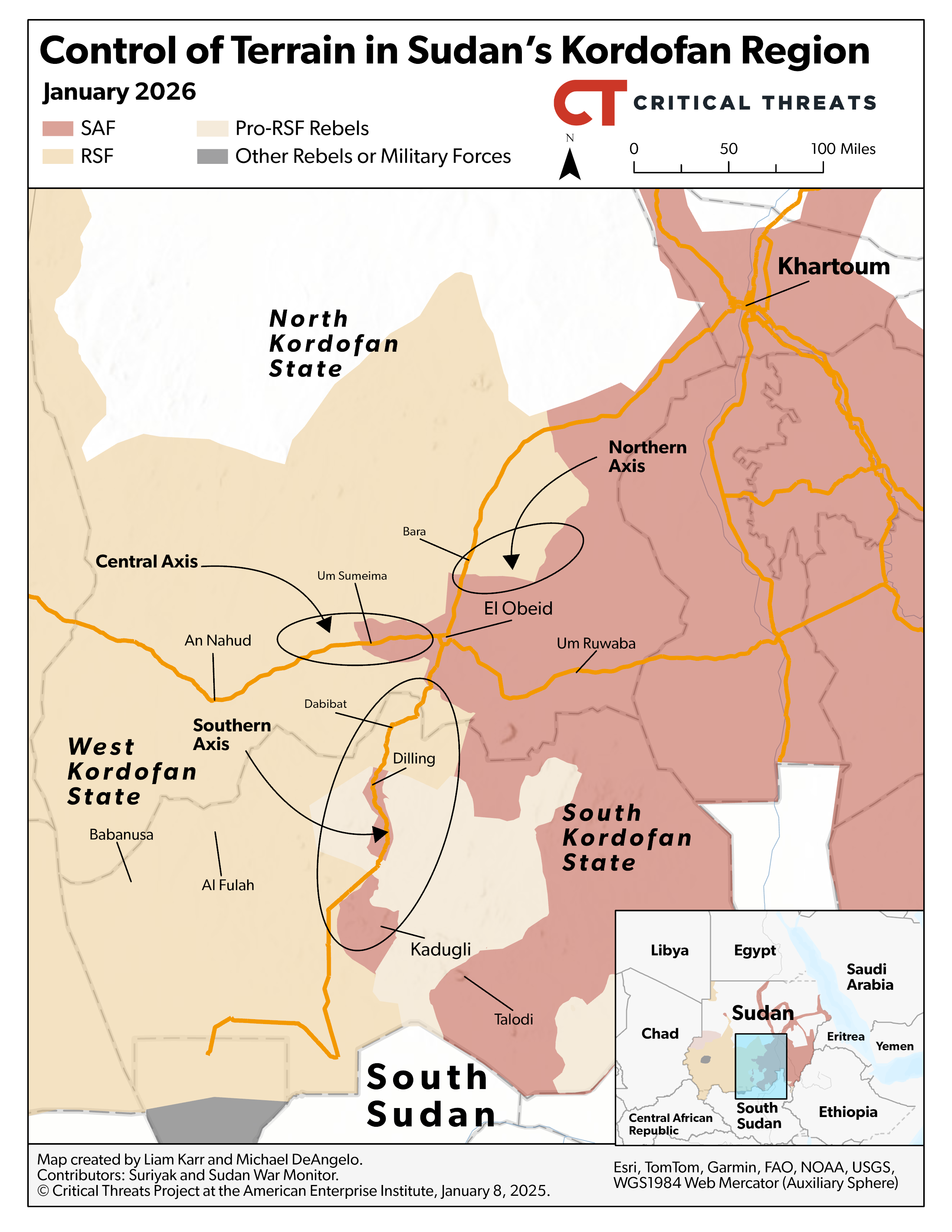 - Sudan. The Rapid Support Forces (RSF) and its allies have intensified their sieges of key towns in south-central Sudan, increasing pressure on the Sudanese Armed Forces (SAF) and threatening the civilian population. Continued RSF gains in south-central Sudan would set conditions for a decisive battle for el Obeid, a strategically vital crossroads town that hosts SAF’s headquarters in central Sudan.