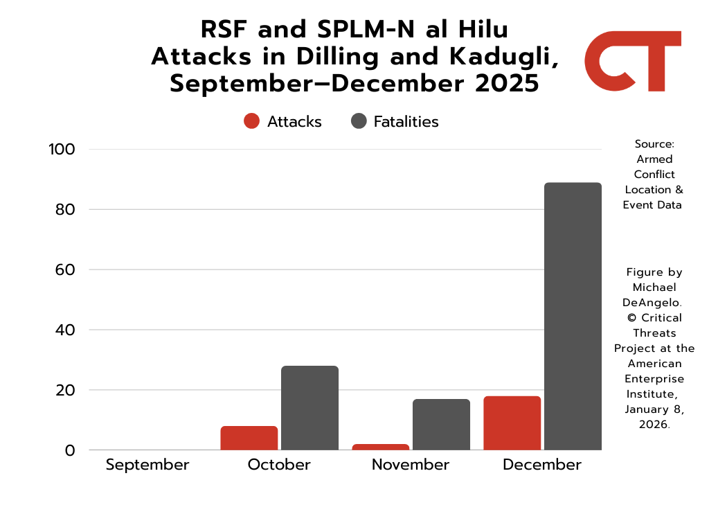 The RSF and SPLM-N al Hilu have conducted almost daily artillery and drone strikes in Dilling and Kadugli since mid-December, mirroring their pre-assault, condition-setting tactics in previous towns such as Babanusa and el Fasher.[87] The RSF conducted frequent artillery and drone strikes in Babanusa and el Fasher, weakening SAF defenses in advance of RSF ground operations.[88] The RSF and SPLM-N al Hilu have conducted at least 18 attacks in Dilling and Kadugli since December 13, compared with 10 attacks over the previous three months.[89] SPLM-N al Hilu called for the SAF to surrender on January 2 in advance of an expected RSF and SPLM-N al Hilu ground offensive.[90]