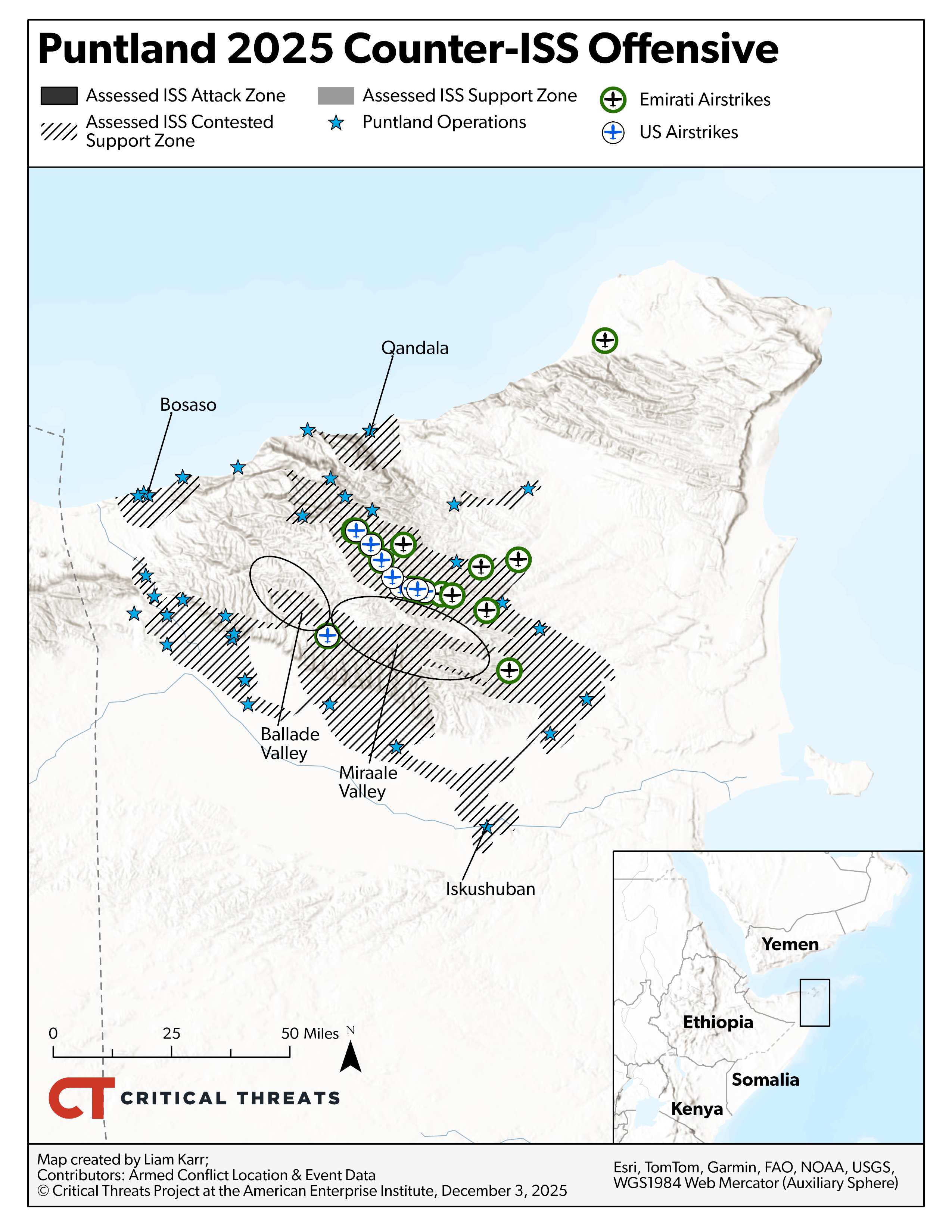 [clxx] https://x.com/AAGA_CAWLAN101/status/1994056249697083444?s=20; https://x.com/BrantPhilip_/status/1995078544297504970; https://www.hiiraan dot com/news4/2025/Dec/203784/puntland_forces_kill_eight_isis_fighters_in_calmiskaad_mountains.aspx