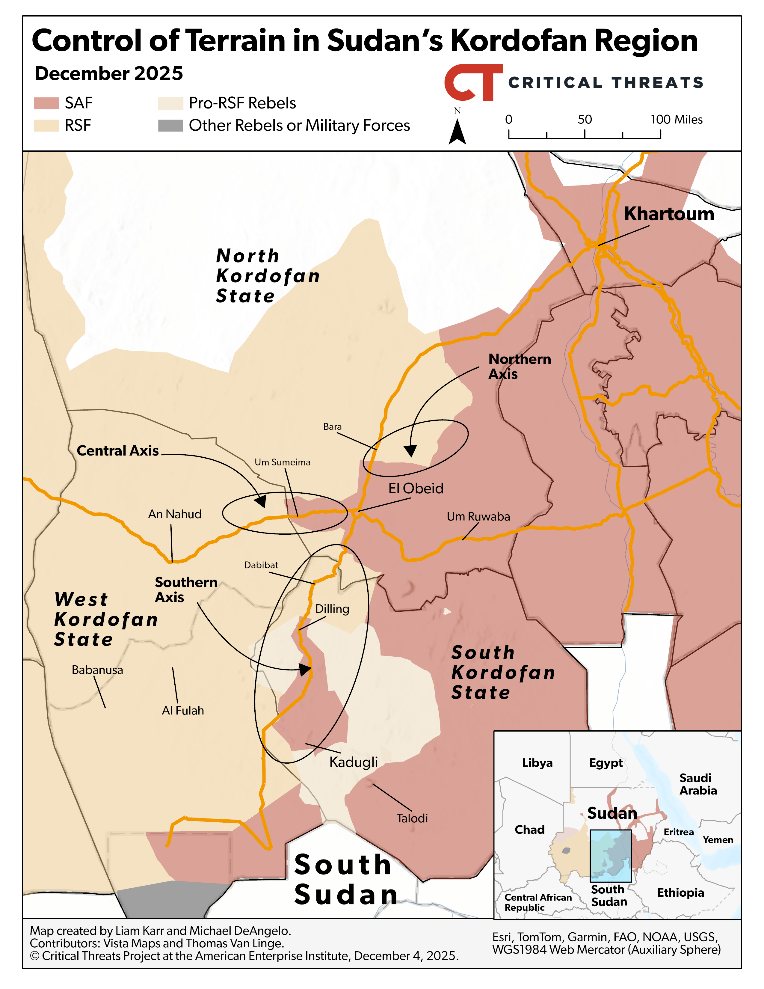 The SAF is attempting to strengthen supply lines on the northern axis between el Obeid and Khartoum. The RSF and SAF have traded control of Bara—located approximately 40 miles north of el Obeid on the road to Khartoum—multiple times in 2025, with the RSF recently capturing it on October 25.[cxv] The SAF launched a counterattack and entered Bara on November 17, but the RSF repelled the advance.[cxvi] The SAF reportedly conducted drone strikes on an RSF supply convoy heading toward Bara on November 29.[cxvii]