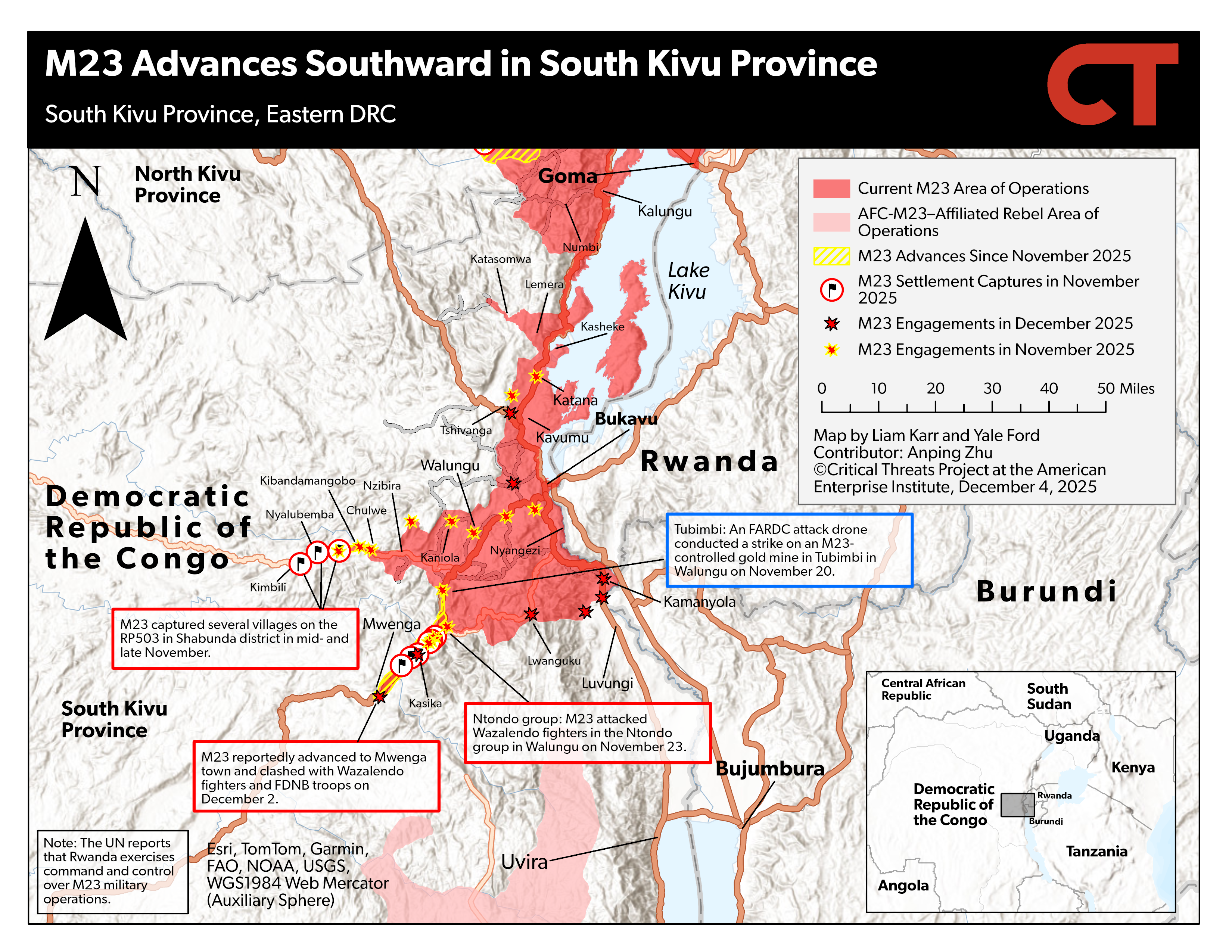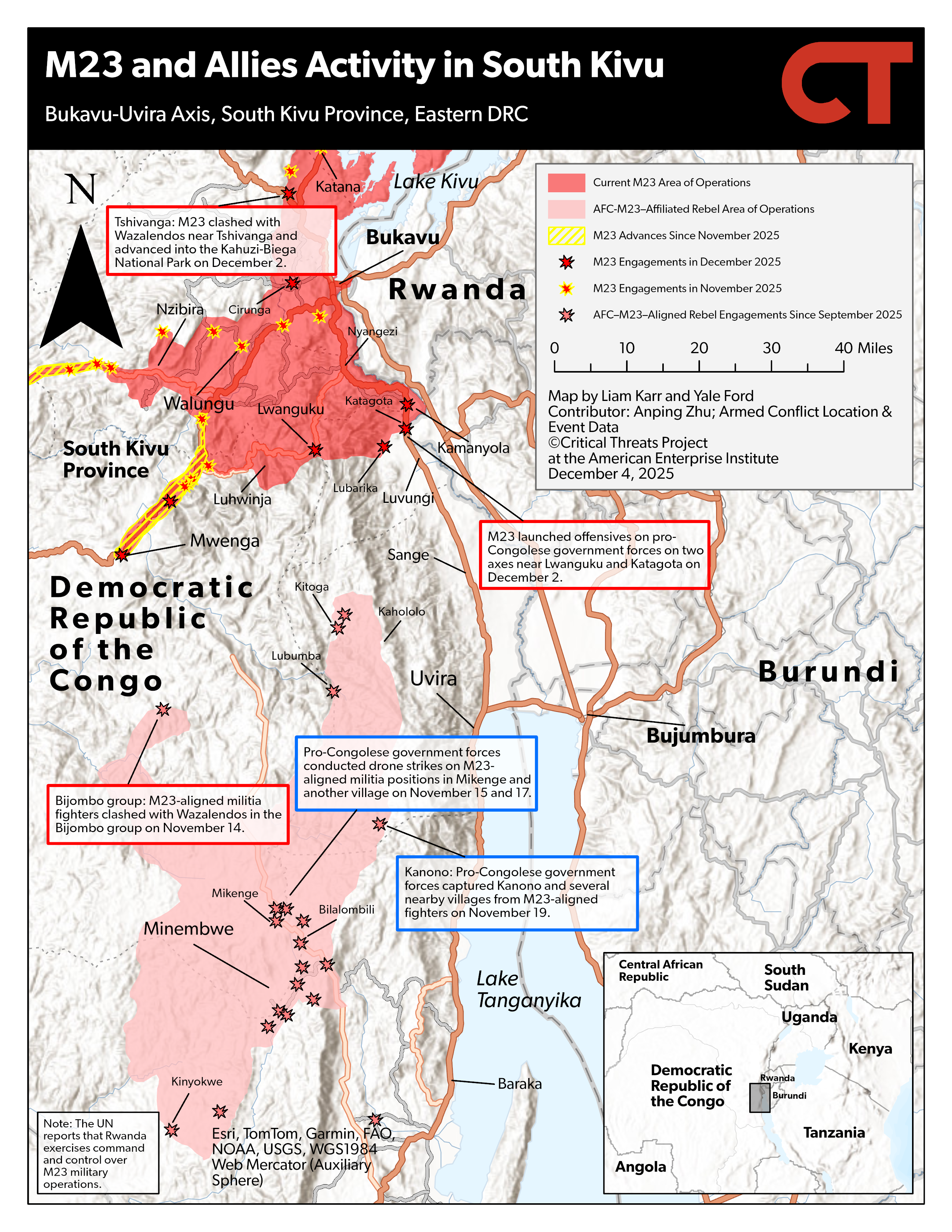 Rwandan-backed M23 rebels have launched at least three separate offensives in South Kivu province in the eastern Democratic Republic of the Congo (DRC) since mid-November. M23 conducted attacks on pro-Congolese government forces—the Congolese army (FARDC), pro-Congolese government Wazalendo fighters, and Burundian army (FDNB) troops—in two frontline areas south of Bukavu, the South Kivu provincial capital, near the RN5 on December 2. The rebel group attacked pro-Congolese government forces in the Kaziba chiefdom in southern Walungu district and tried to break through to reportedly flank enemy positions on the RN5 to capture Luvungi village on the RN5.[i] M23 has partially controlled Kaziba since a late April offensive in southern Walungu. M23 simultaneously conducted attacks on government forces on Katagota village, which is about 35 miles south of Bukavu and three miles south of M23’s forward position in Kamanyola, on December 2.[ii] The front line between M23-controlled Kamanyola and Katagota has largely been frozen since March. M23 had reportedly reinforced its ranks with more troops and heavy weaponry in the days prior to launching the attacks in both areas.[iii]