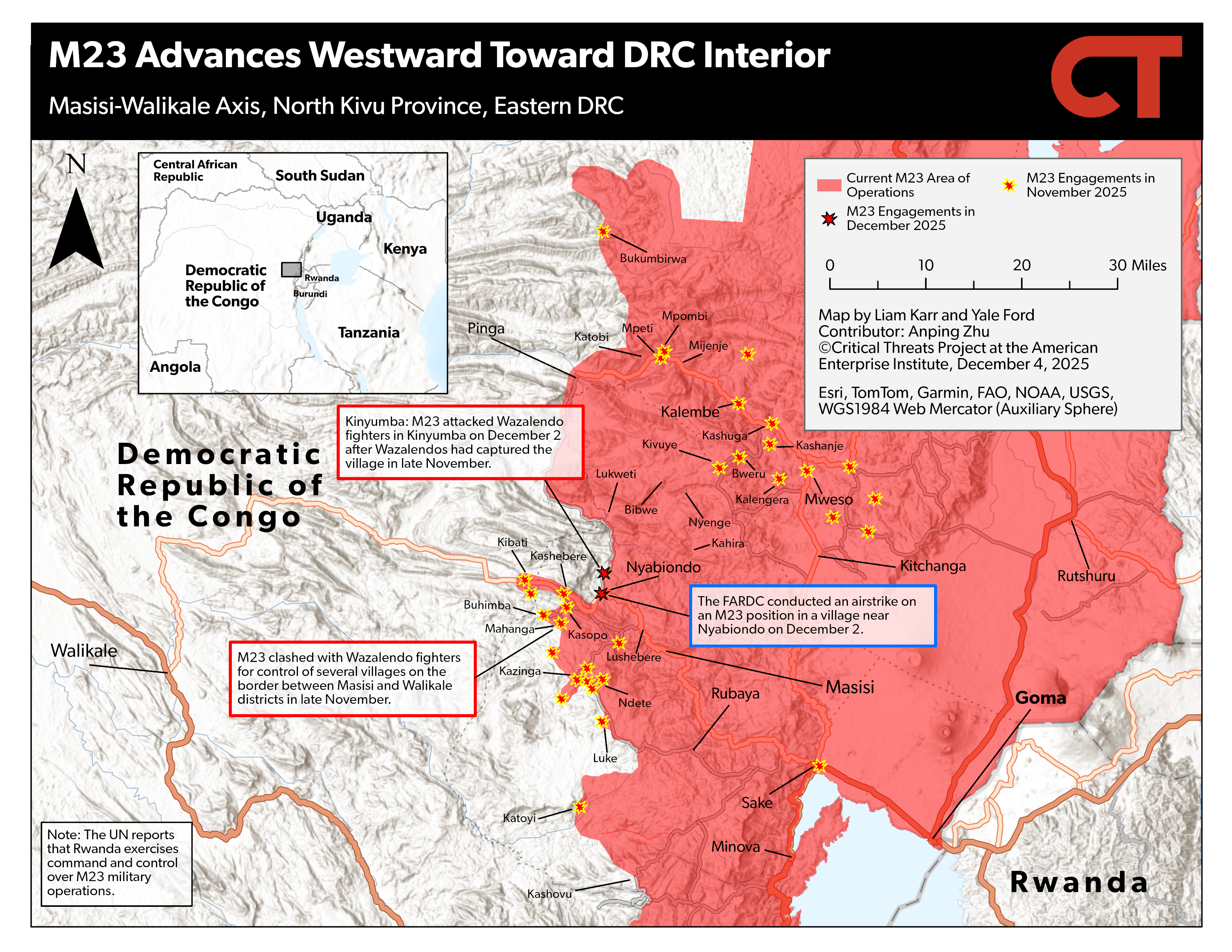 Wazalendo fighters recaptured a village from M23 north of Nyabiondo on a local road that leads to Pinga in late November, possibly to prevent M23 from advancing north to Pinga.[xxvi] Pinga is a key town due to its vital infrastructure and location as a potential launching pad for future M23 offensives into the DRC interior. Pinga hosts an airstrip, an army base, and a hospital.[xxvii] This infrastructure makes the town a favorable staging ground for M23 expansion deeper into mineral-rich Walikale territory or Maniema and Tshopo provinces. Holding Pinga would mark a notable expansion in M23’s areas of control given the town’s history as a contested stronghold.[xxviii]